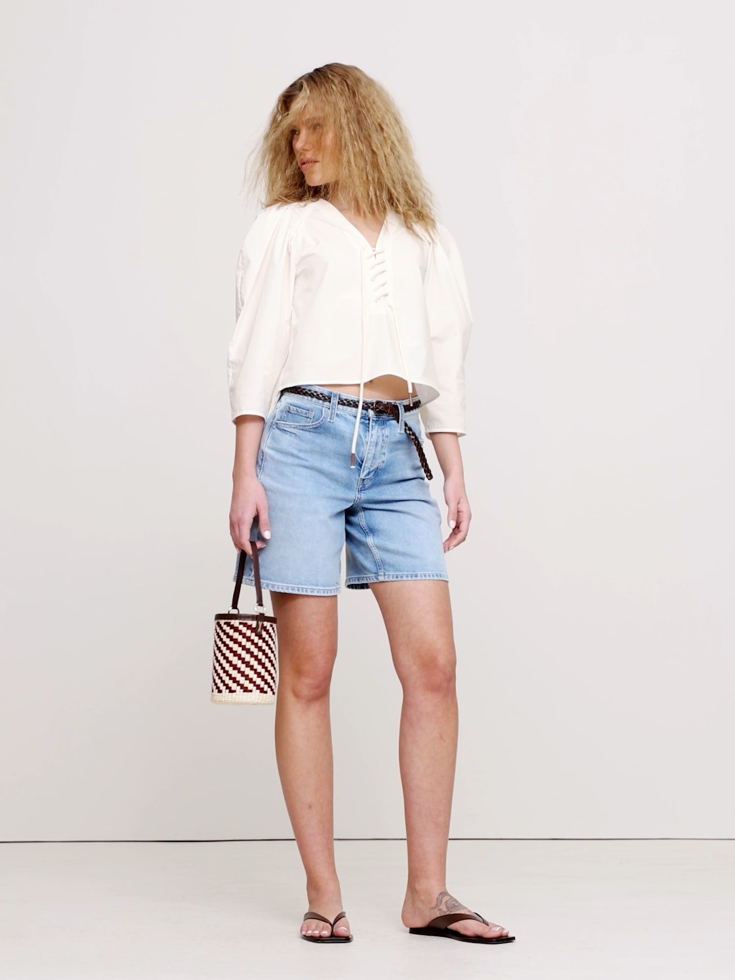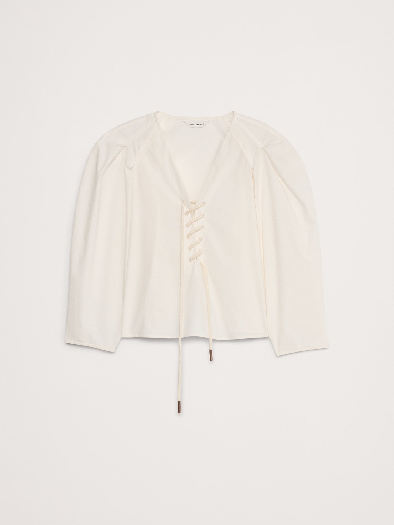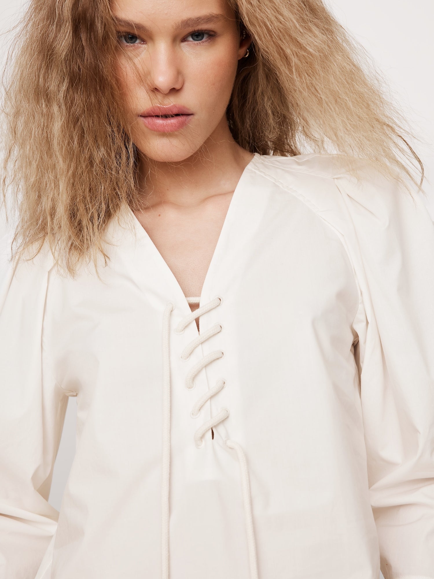 لقد قمنا بقص هذا البلوزة سهل الإرتداء بأكمام واسعة وفتحة أمامية برباط - بنسبة 100% من قماش قطن بوبلين الفاخر.