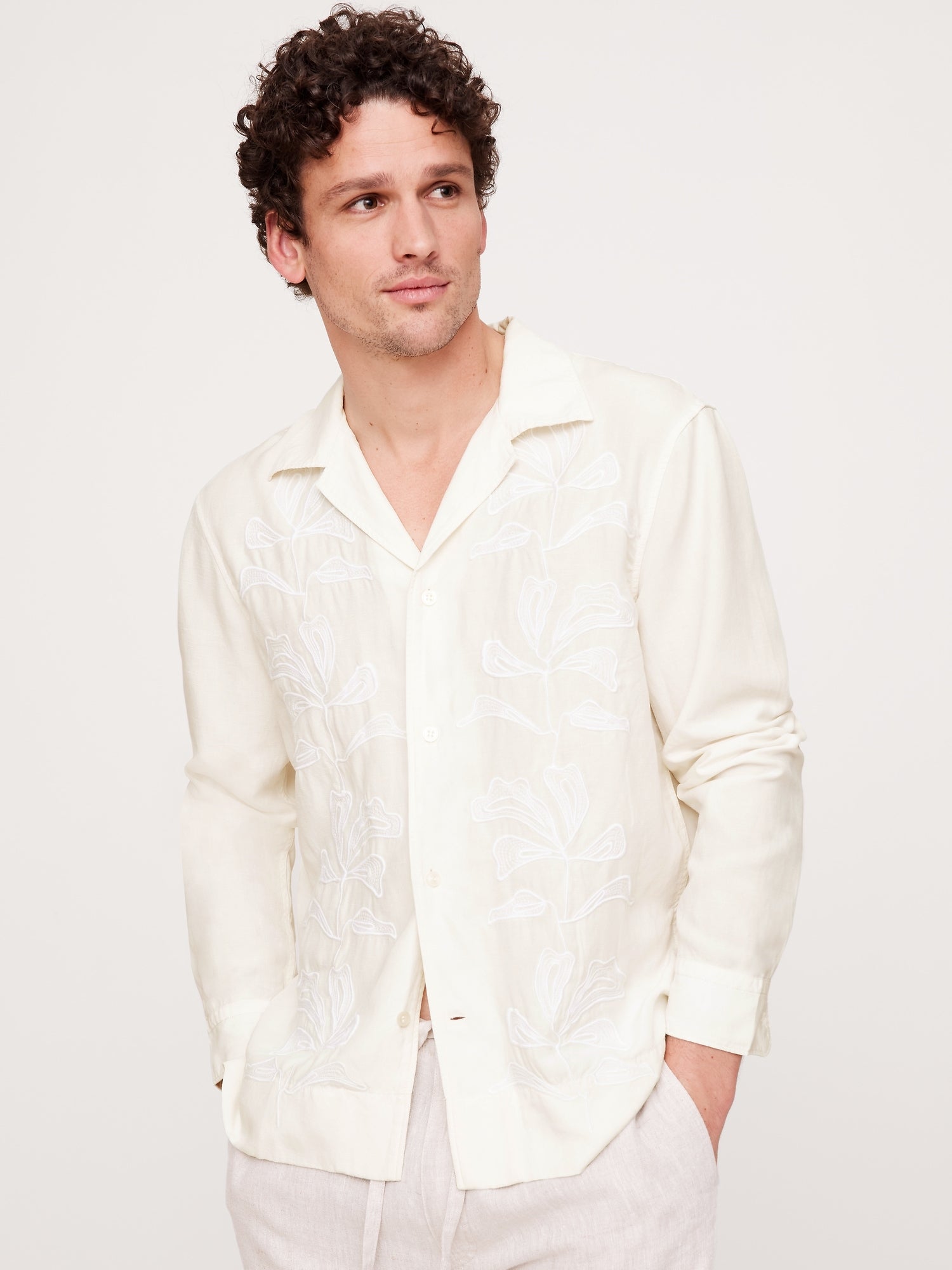 قميص ريزورت مطرز تنسيل™-كتان بأكمام طويلة