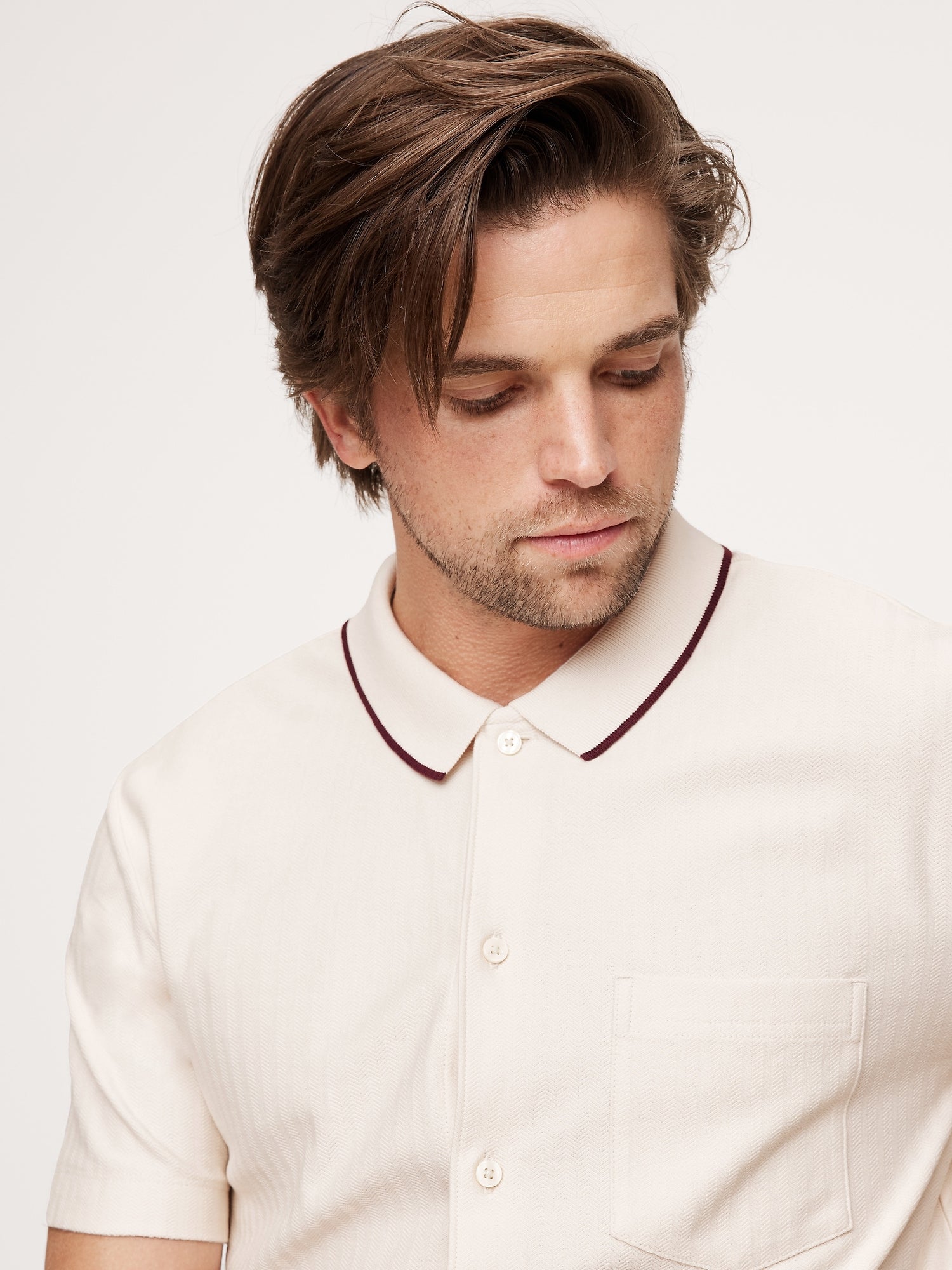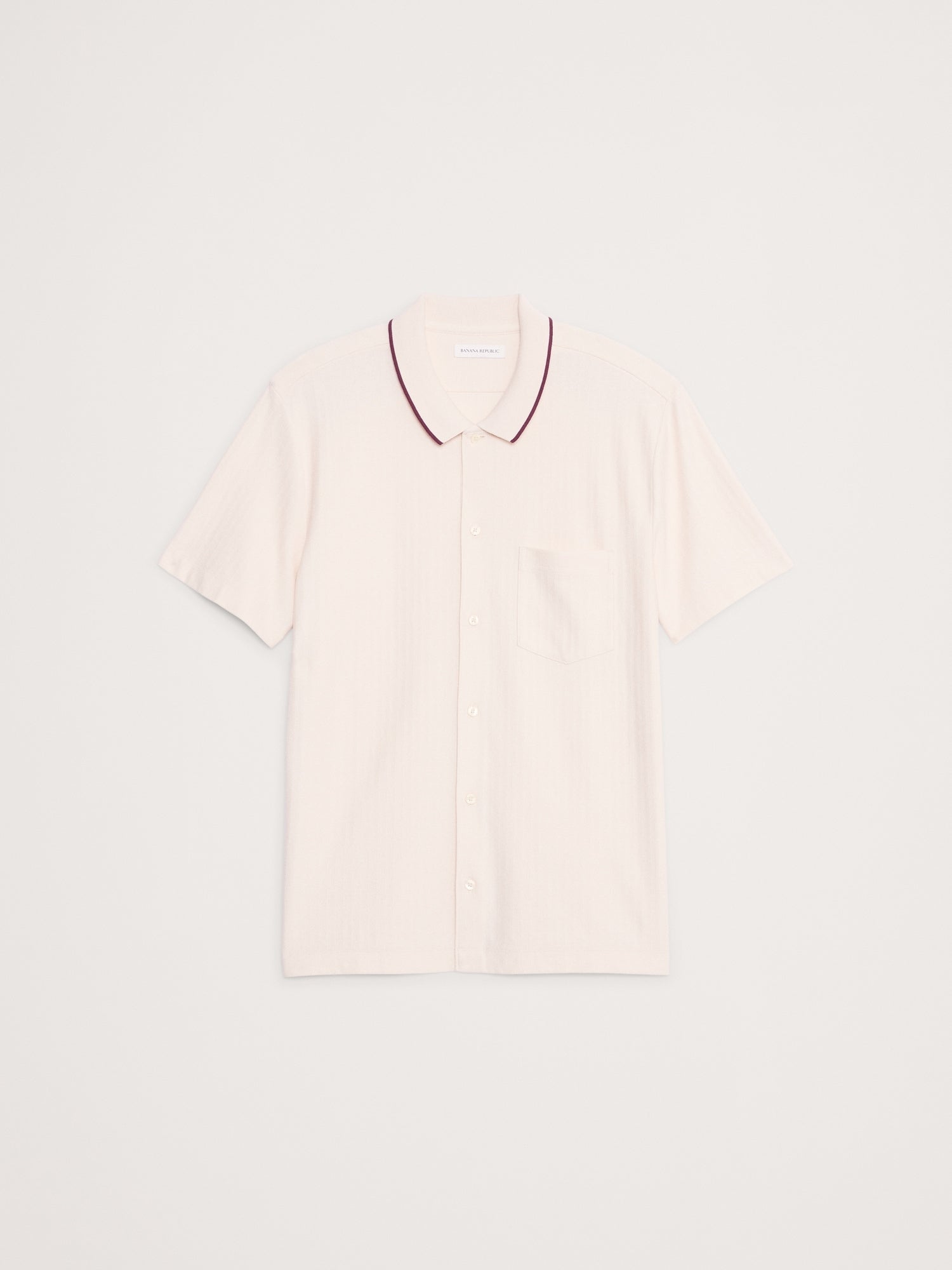 We love the herringbone texture of this soft, resort shirt. Plus, we added a contrast color accent at the collar for a vintage vibe.