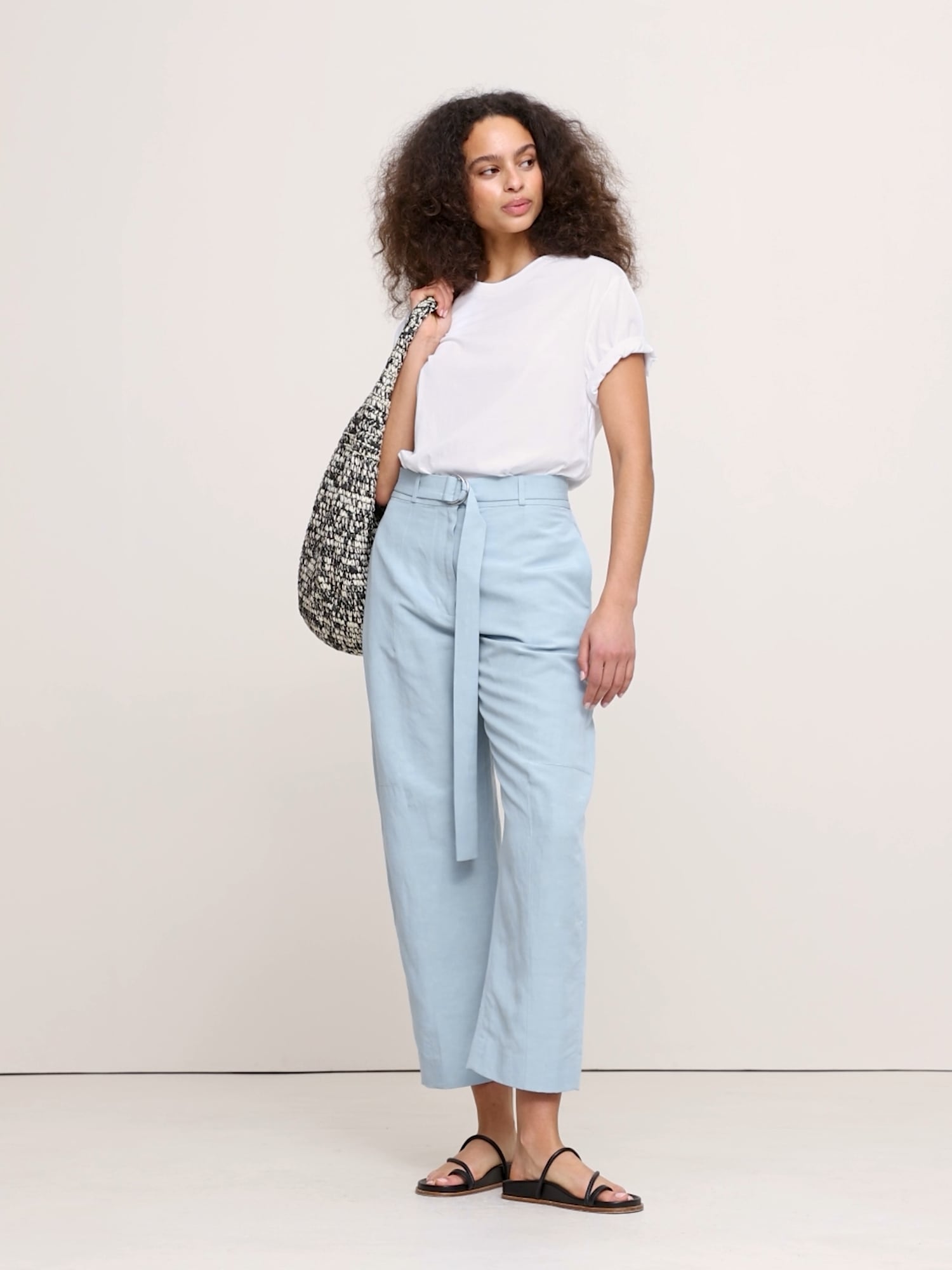 لمستنا الخاصة على بنطلونات الموسم بقصة ساق برميلية، مع درزات خاصة عند الركبة والحاشية لمنحها شكلًا منحنيًا خفيفًا عند الساق. مصنوعة من مزيج من قماش التنسيل™ اللايوسل والكتان - خيار مثالي في الحرارة والرطوبة.