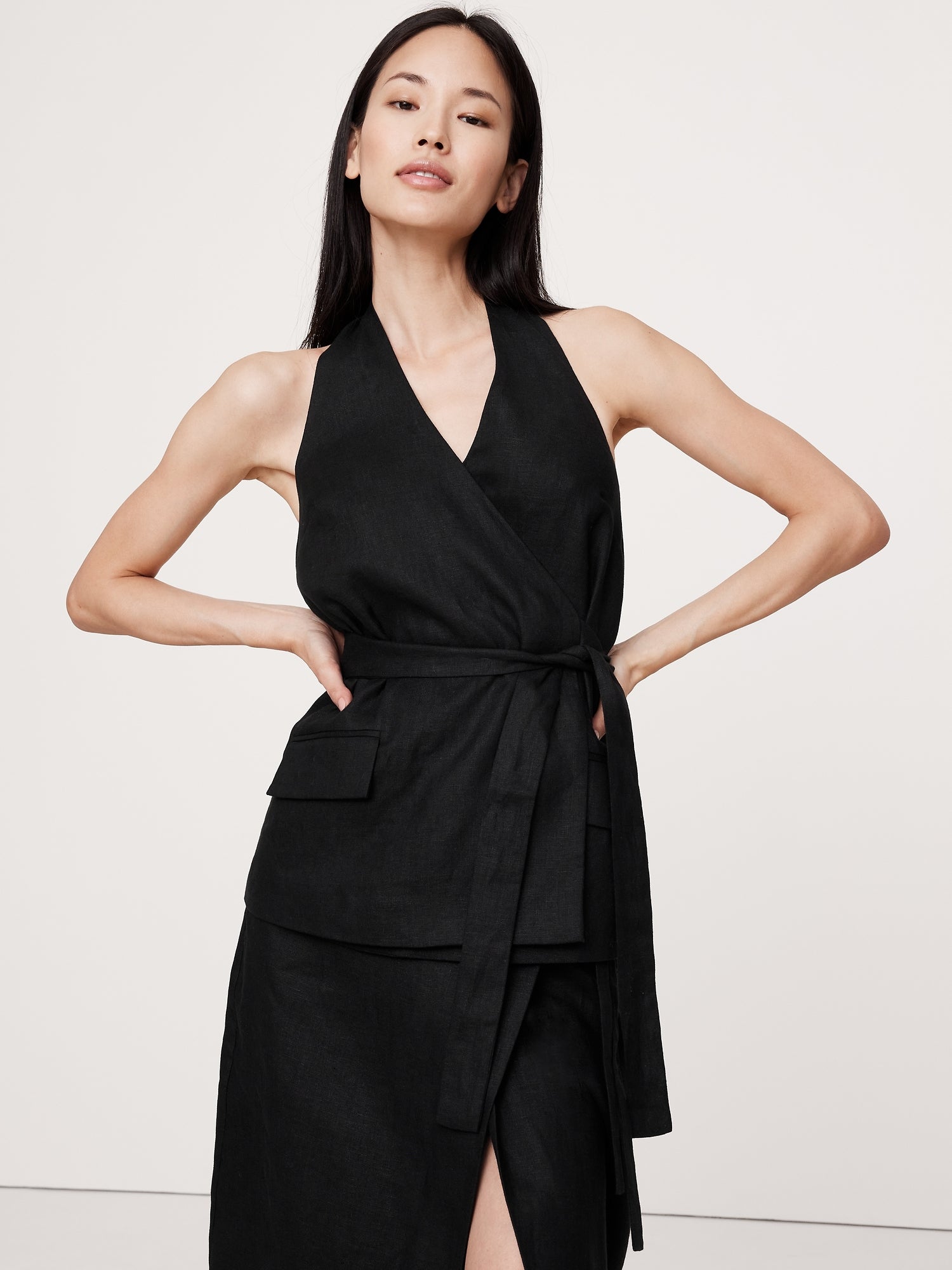 Ready for warm weather, this linen halter top has a wrap-front and a tunic length—in 100% certified-European linen, just the way we like it.