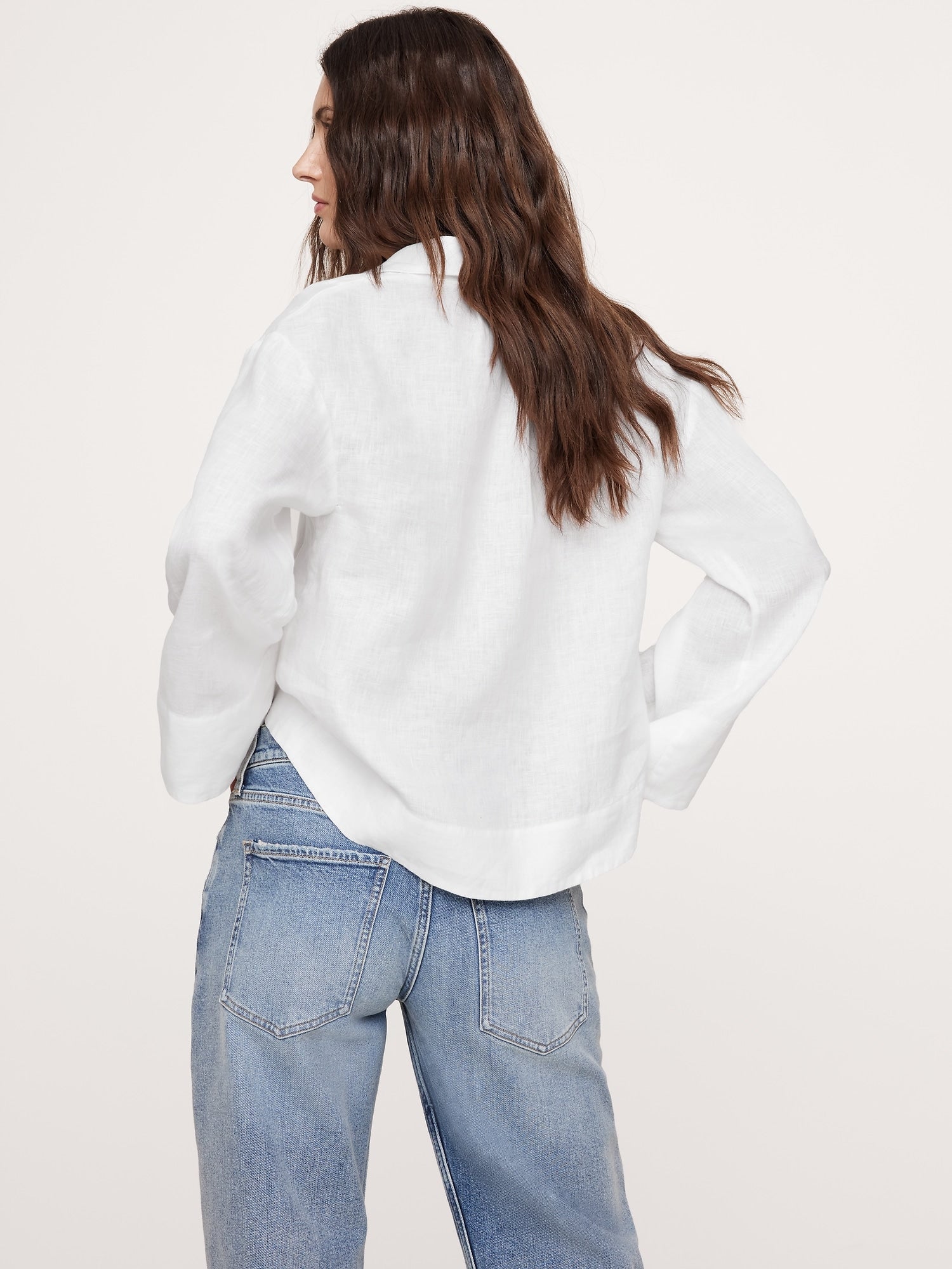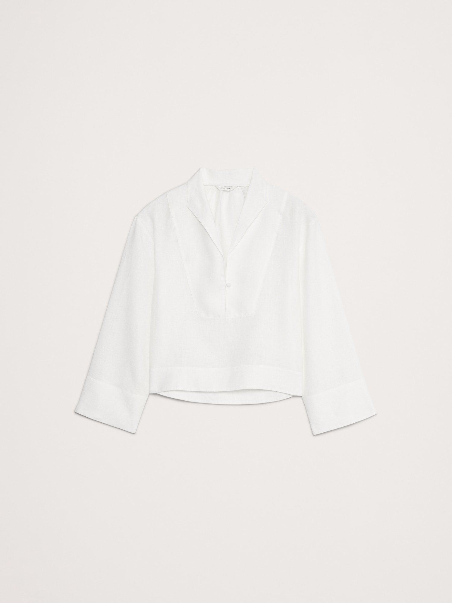 An easy popover top, in 100% certified-European linen. We added wide sleeves and a split neck with a single button.