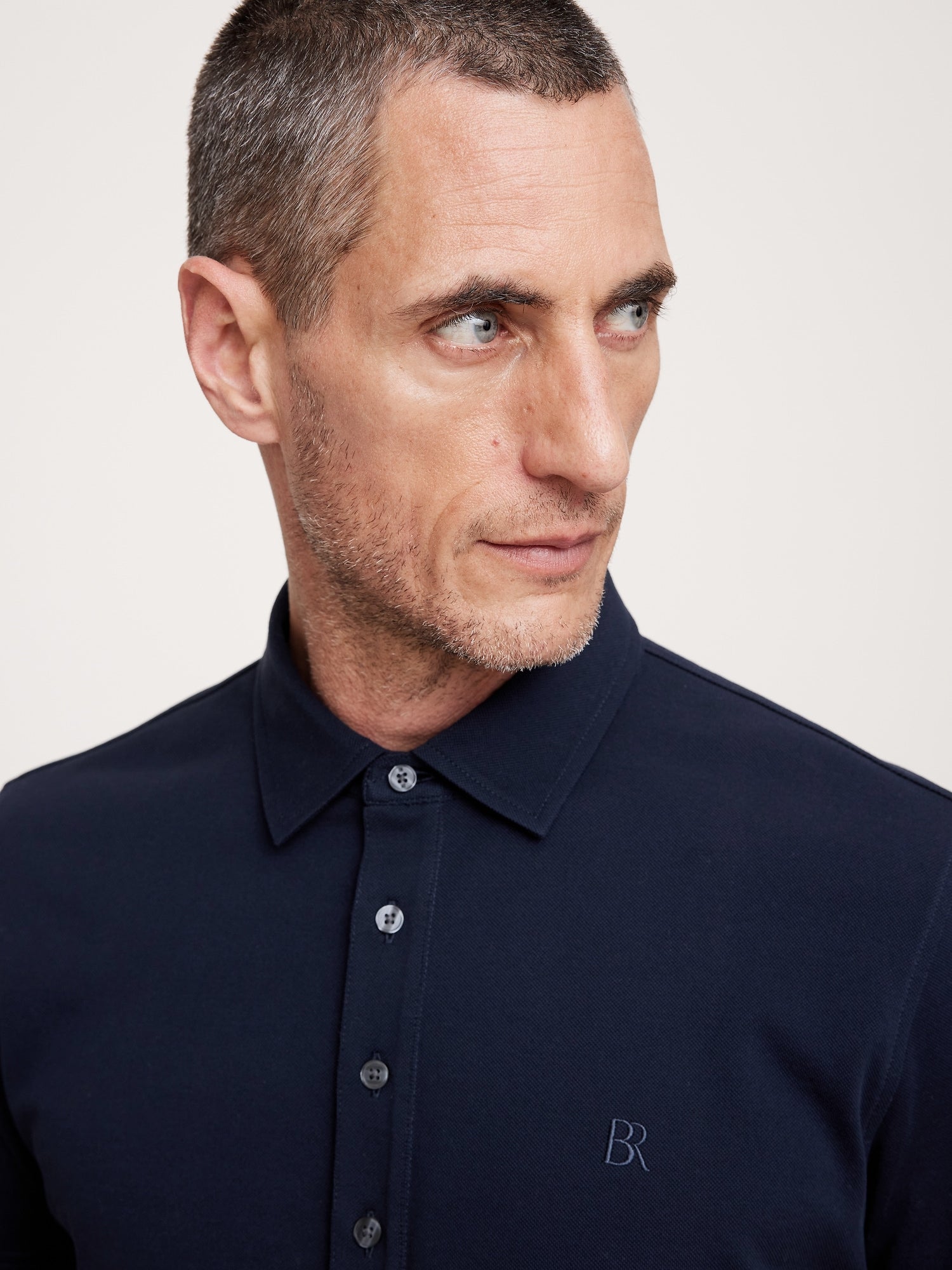 ياقة بولو مع إغلاق بأزرار أمامية.
