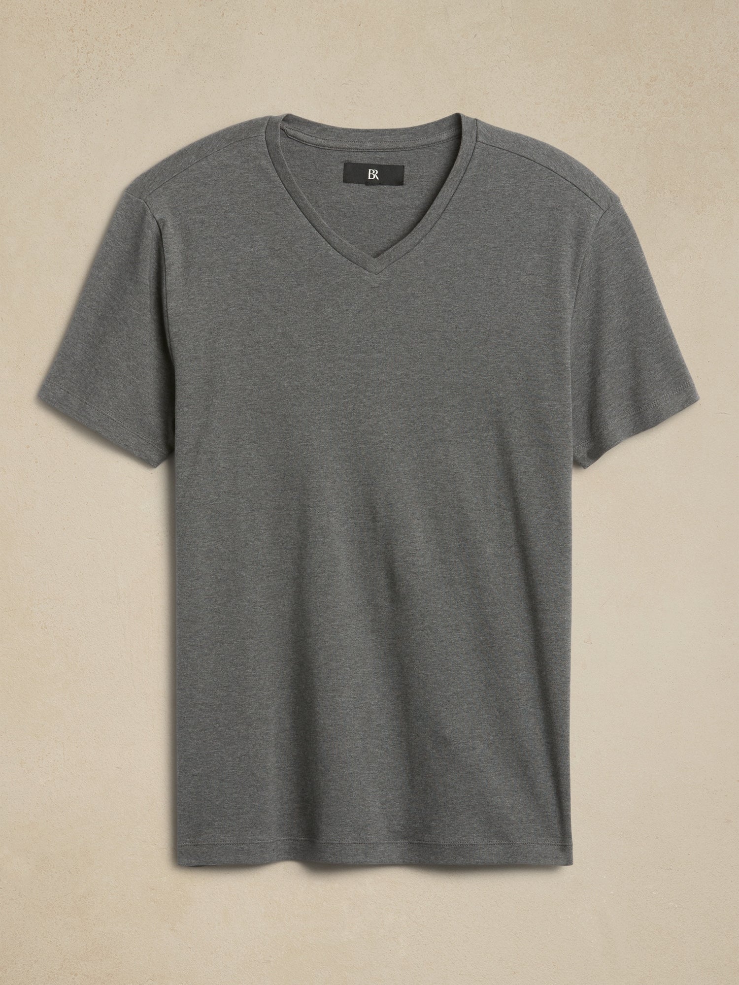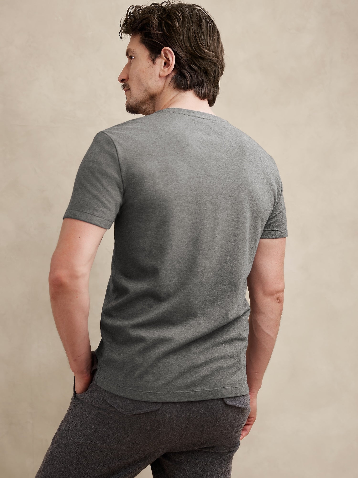 هذا القميص الكلاسيكي ذو الياقة على شكل حرف V مصنوع من قماش الجيرسي القطني الفاخر الذي نفضله بسبب نعومته المميزة ولمسته الناعمة التي تمنحه مظهرًا أكثر أناقة.