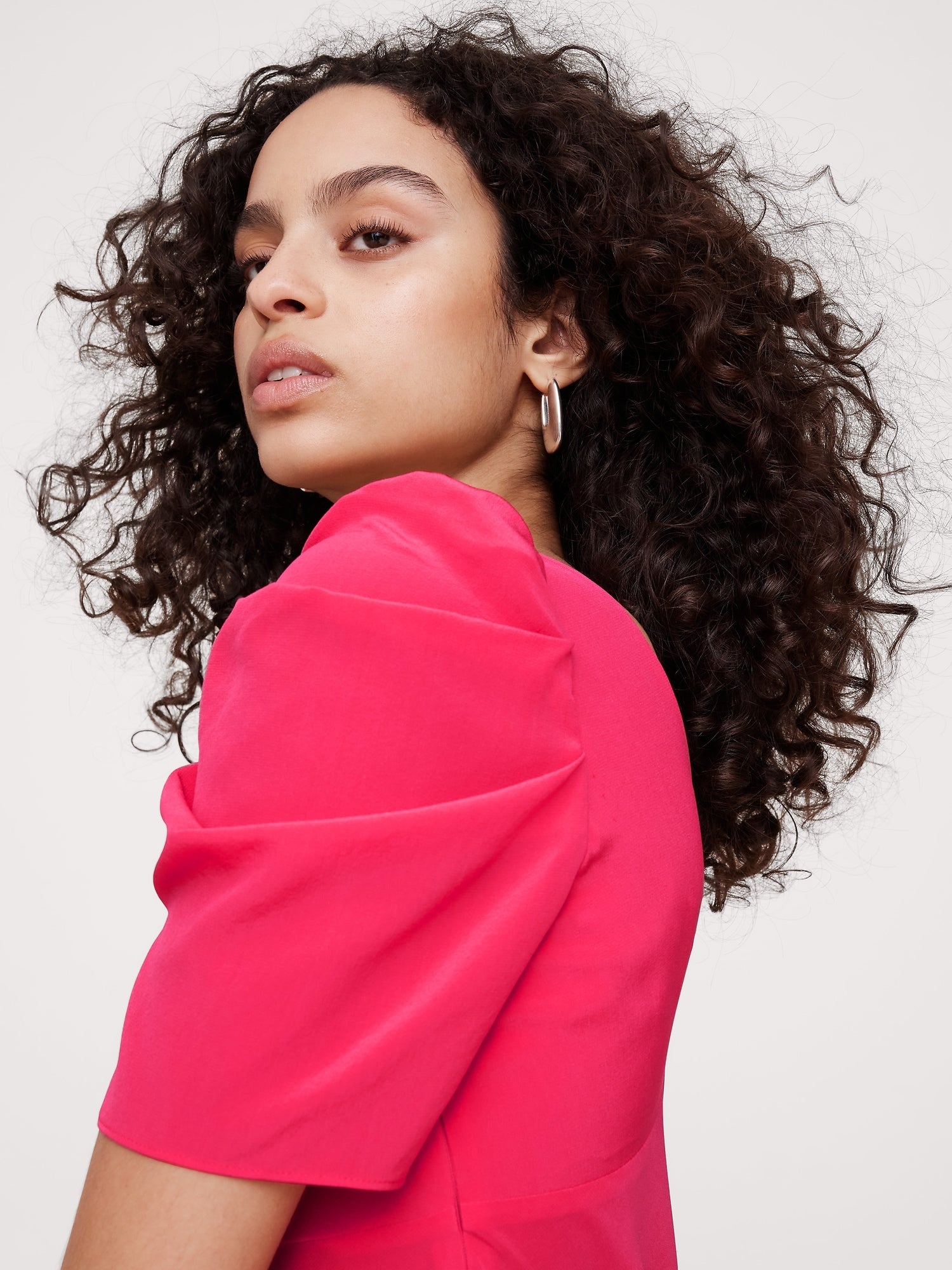 مناسبة رائعة لتأكيد الحضور. هذا الفستان الحريري مستوحى من تصميم فستان كلاسيكي من التسعينيات، مع تحديثات بأكمام منفوخة ومنسدلة، ونسيجكريب دي شين الحريري المميز لدينا، وهو قماش نعشقه لملمسه الفاخر ومظهره غير اللامع. هل ذكرنا أيضًا أنه قابل للغسل في الغسالة؟