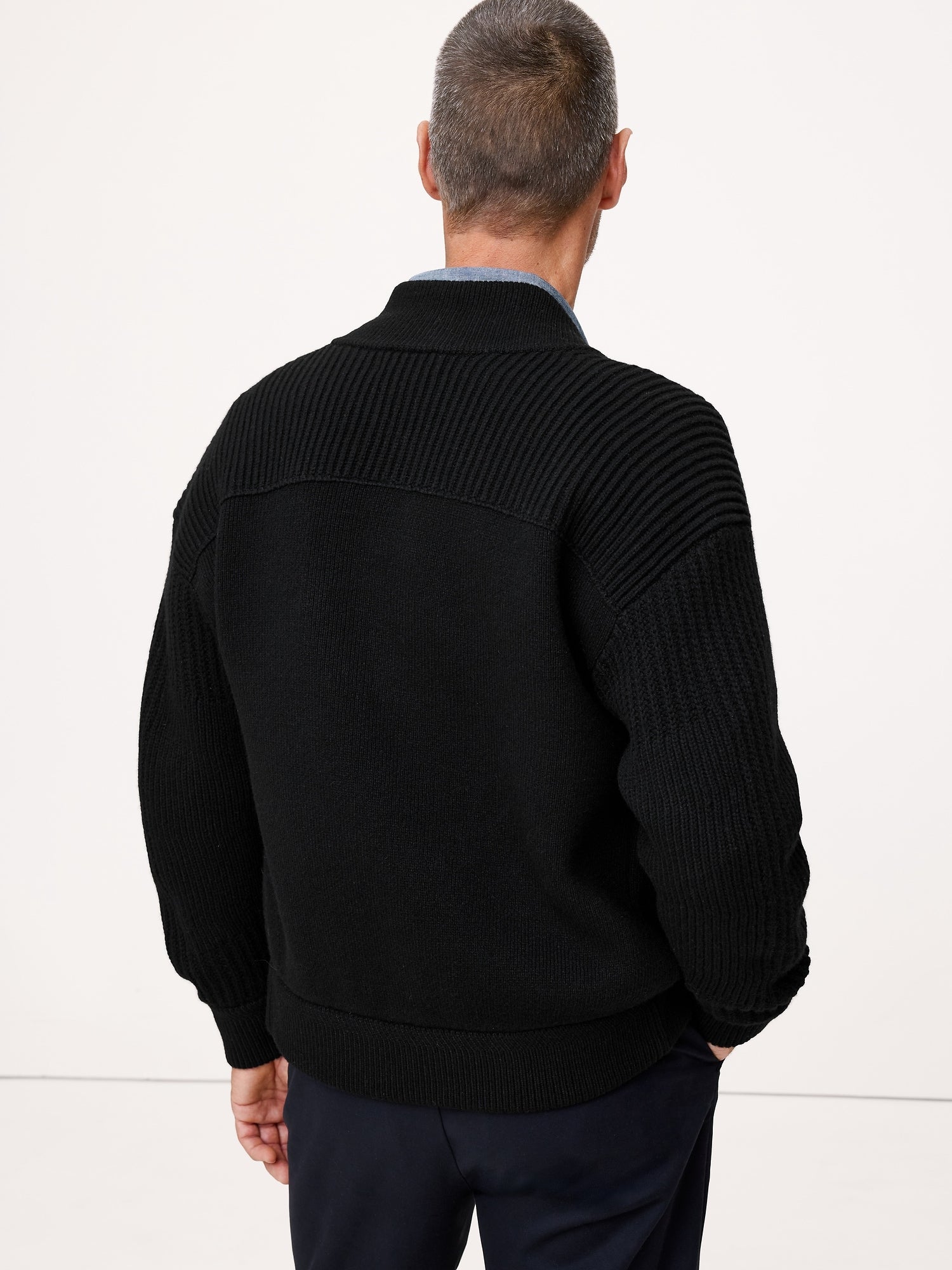 We borrowed design details from the classic bomber jacket for this zip-up sweater, selecting ribbed stitches to create panels at the shoulders and arms. Here, we selected one of our favorite Merino wool blends, which we love for its ability to add warmth without adding too much weight.
