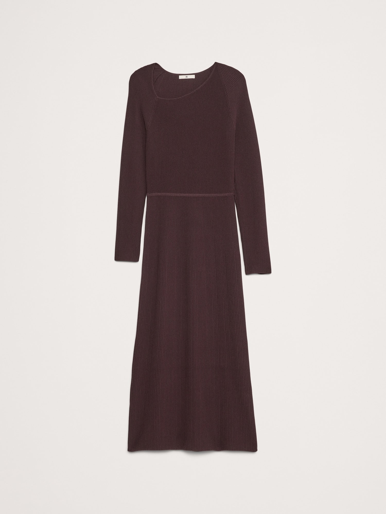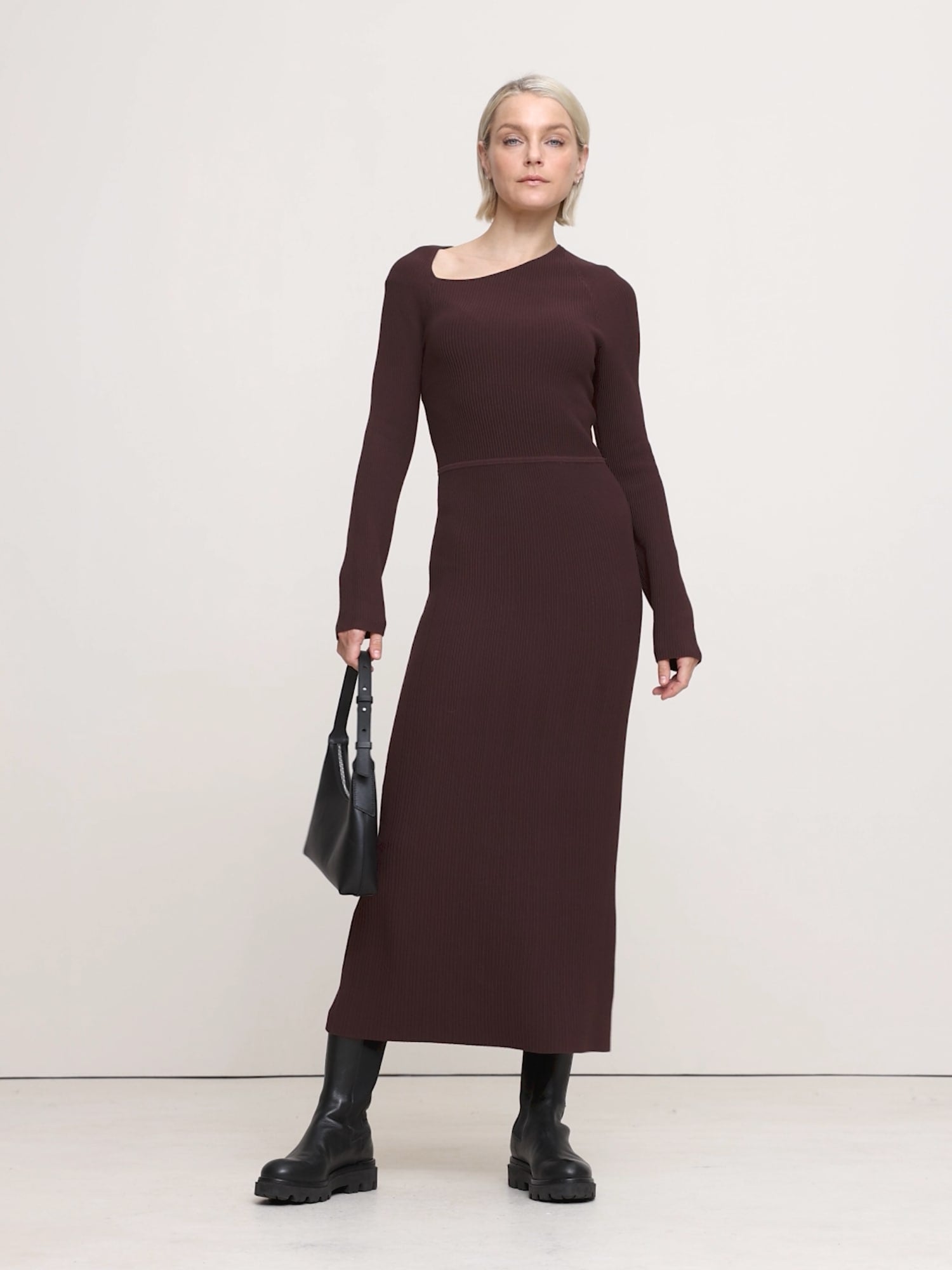 هذا الفستان الذي يعانق الجسم محبوك باستخدام خيوطنا الملساء عالية المرونة، والتي تم استخدامها هنا مع غرزة مضلعة لتأثير محيطي يضفي نعومة على الجلد. هنا، اخترنا فتحة الرقبة غير المتماثلة للموسم، جنبًا إلى جنب مع صورة ظلية ملائمة وواسعة النطاق.