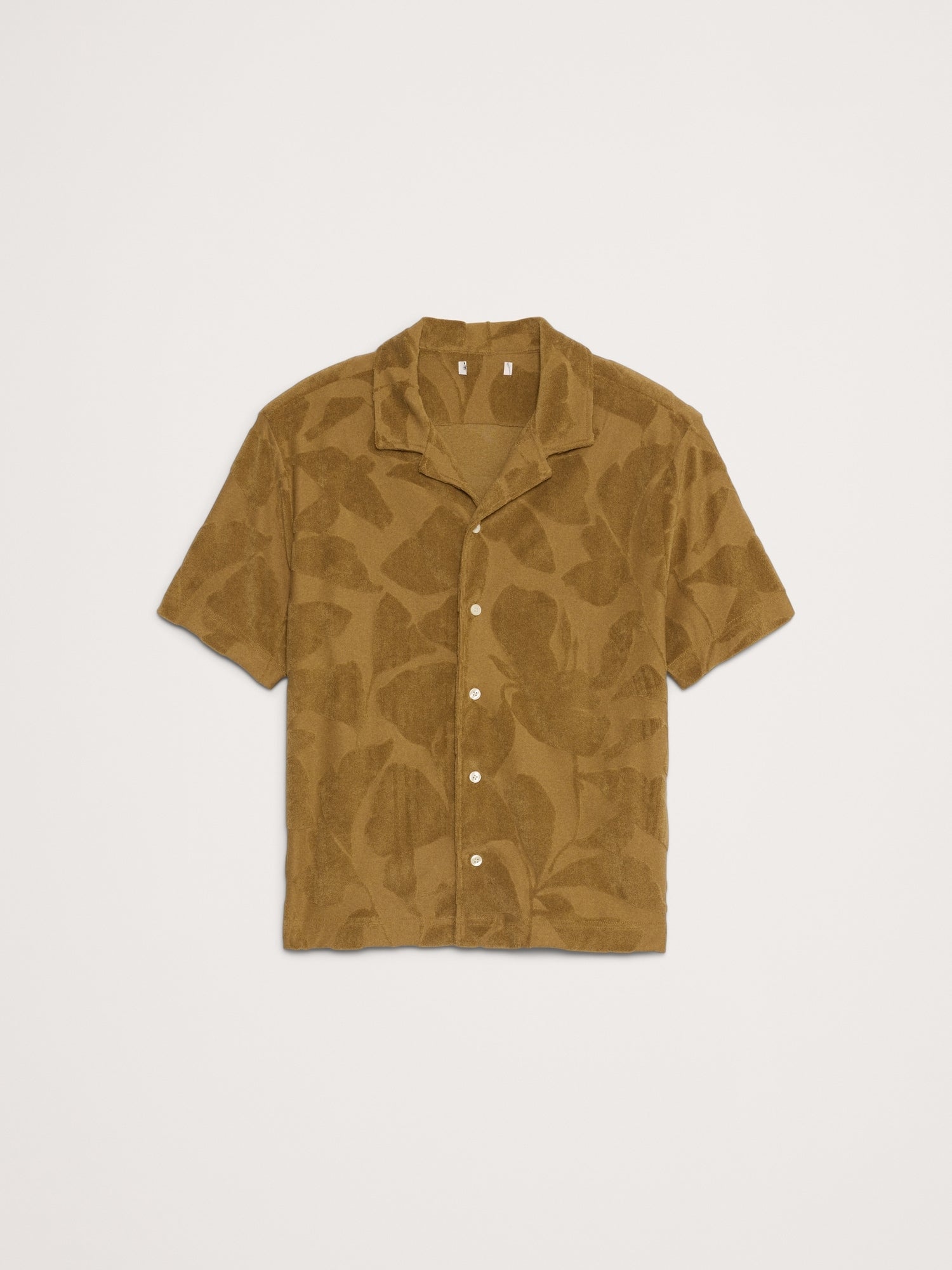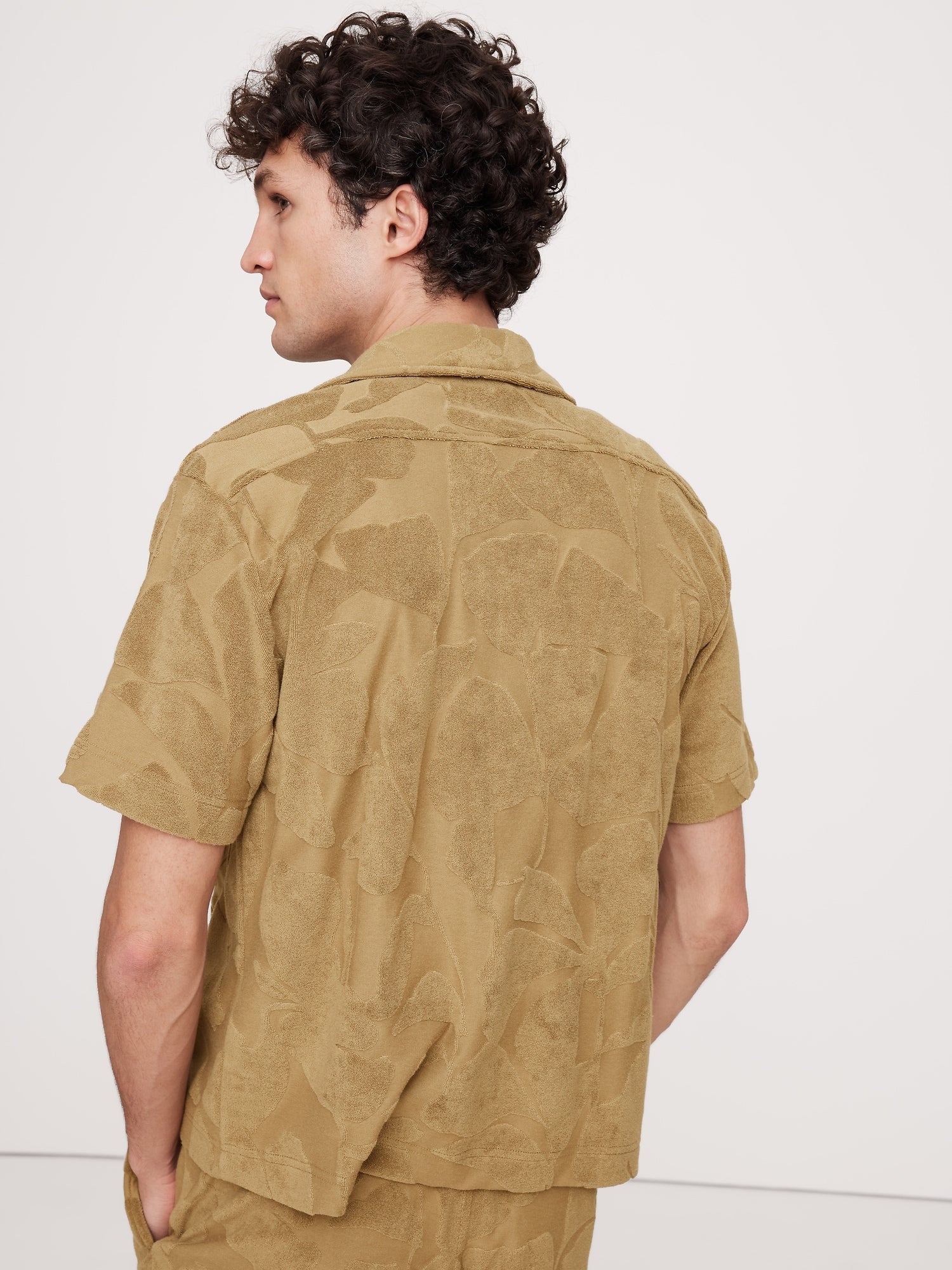 قميص كلاسيكي للعطلات، مصنوع من قماش تيري ناعم بأنماط هندسية، مناسب للأجواء الدافئة. نسقيه مع شورت مطابق أو مع بنطال جينز خفيف مفضل لديك.