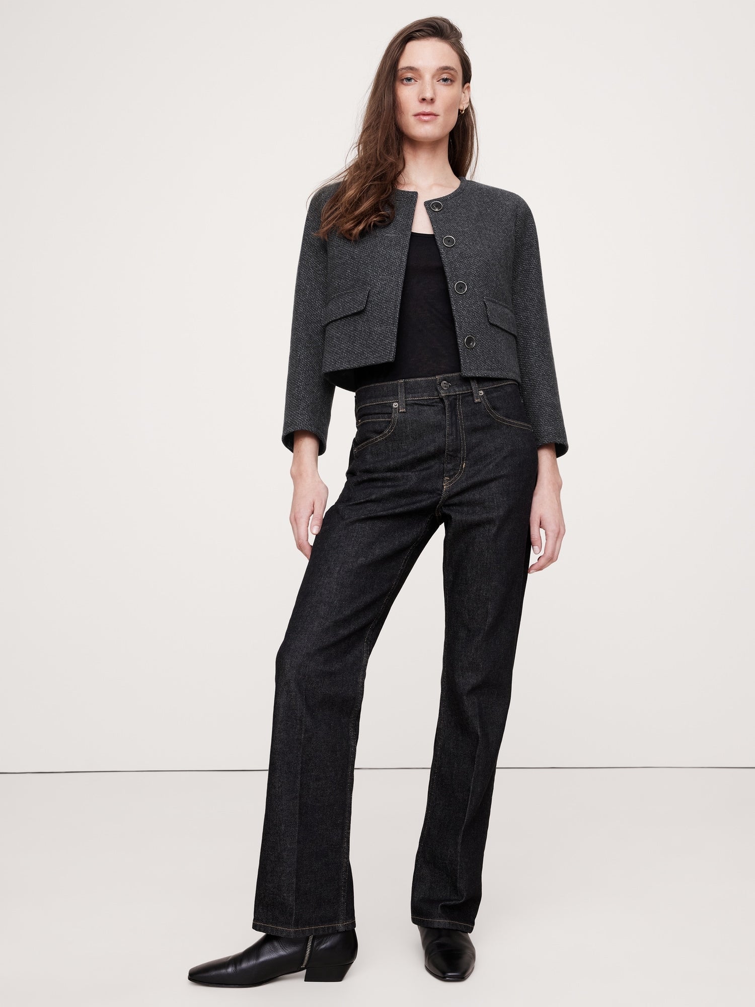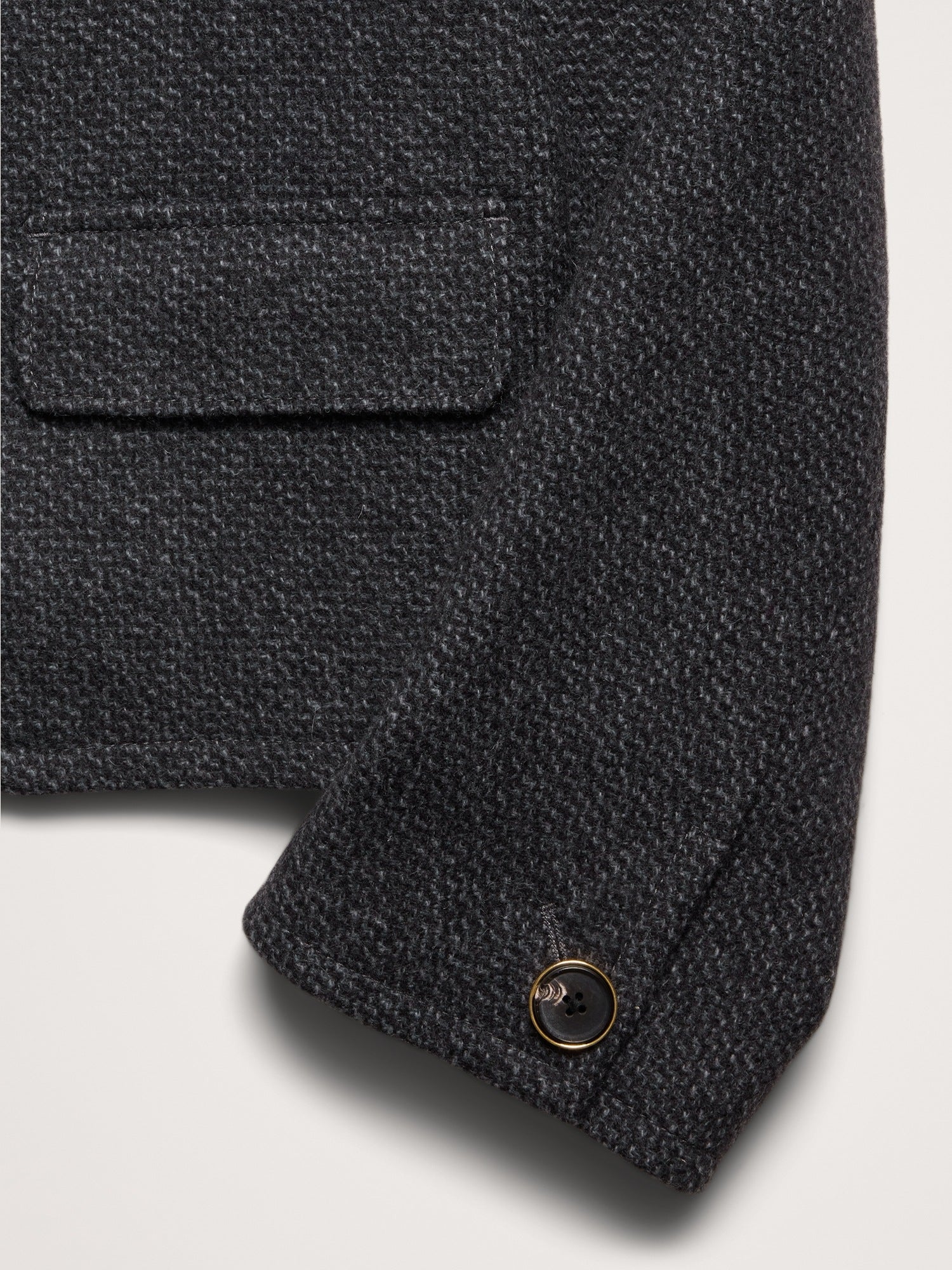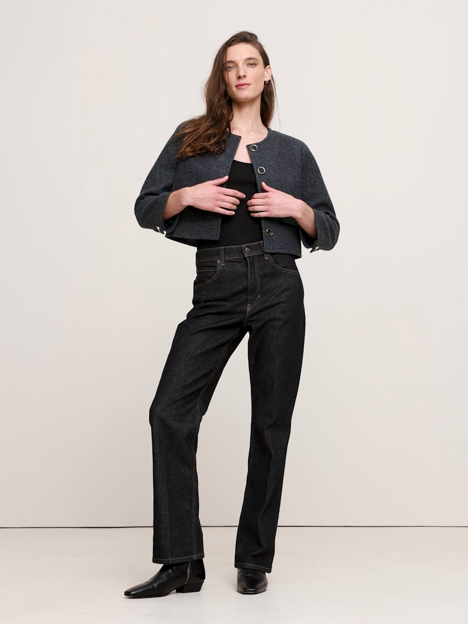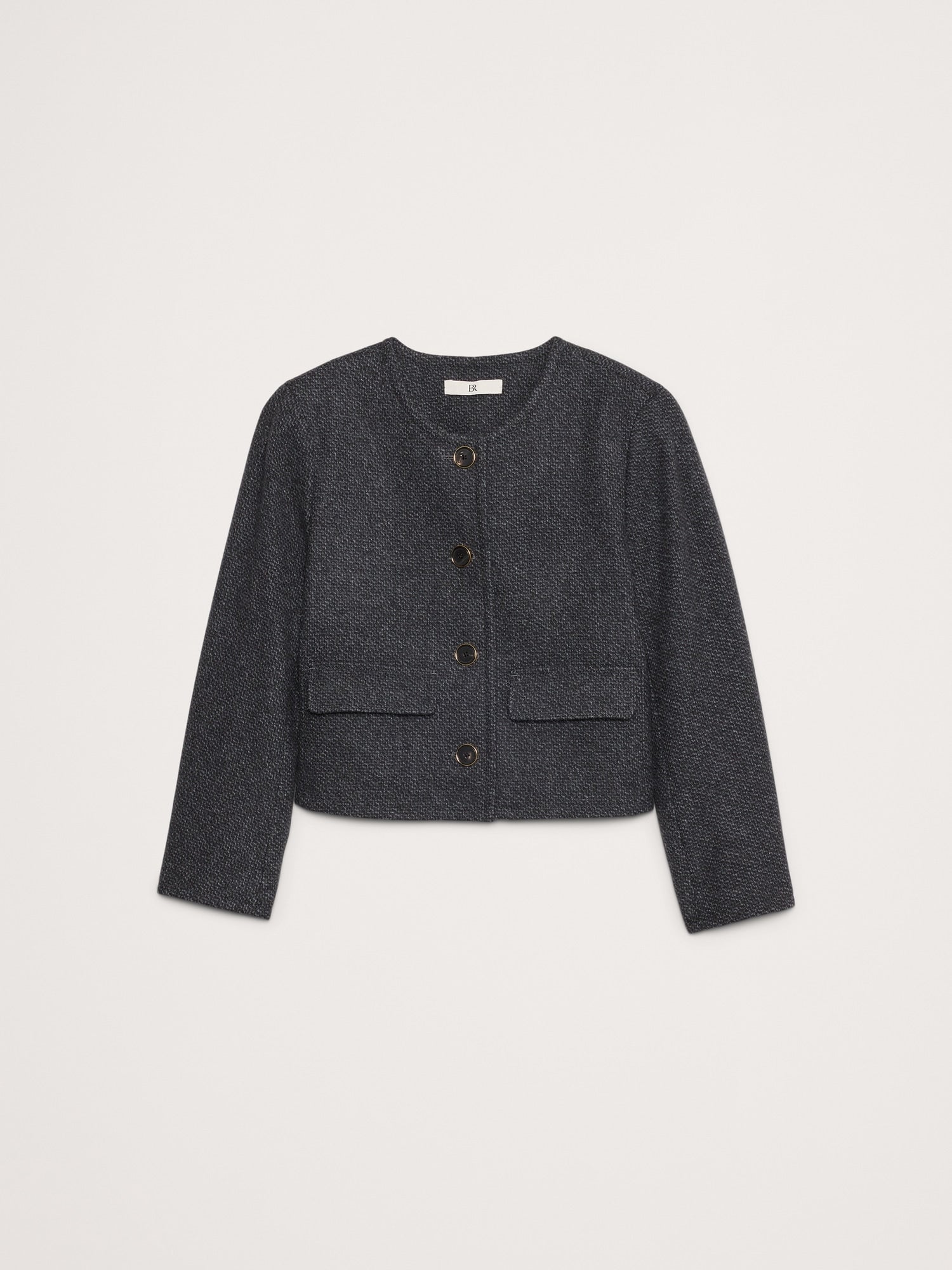 جاكيت نسائي بدون ياقة مصمم قليلاً ومريح قليلاً، ويتمتع بتصميم أنيق، ولكنه لا يبدو متكتلاً أبدًا بفضل طوله المقصوص، وأكمامه التي تصل إلى طول السوار، وقماش التويد الجميل المصنوع من مزيج الصوف بلون أزرق داكن.