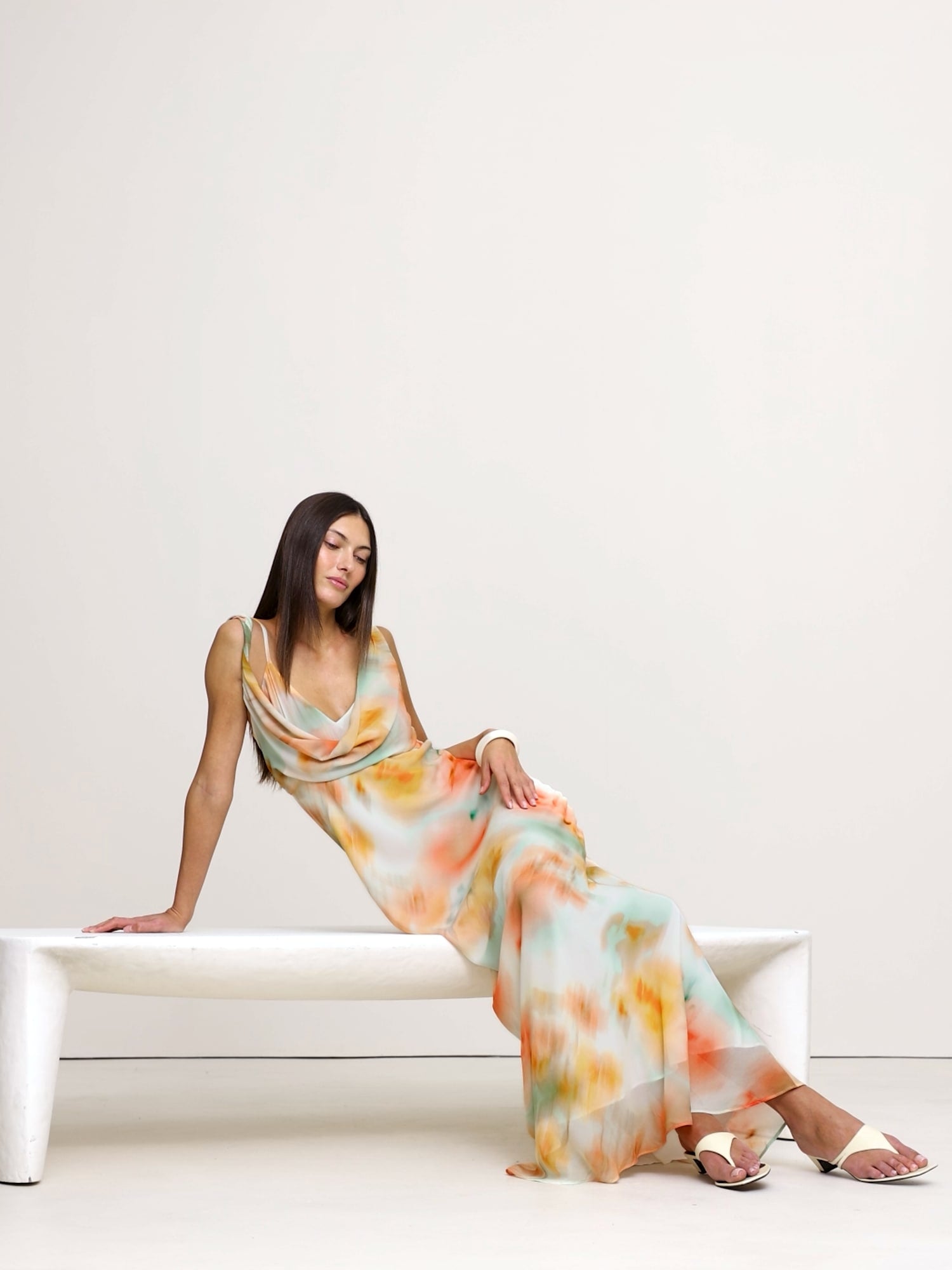 هيا، تفضلي، تفضلي. هذا الفستان، لمسة جديدة على فساتين الموسم بتصميم فضفاض، مصنوع من كريب فيسكوز خفيف كالشيفون مع مرونة خفيفة. تفاصيل الكتف الملتوية والأجزاء بقصّة مائلة تُبرز قوامه.