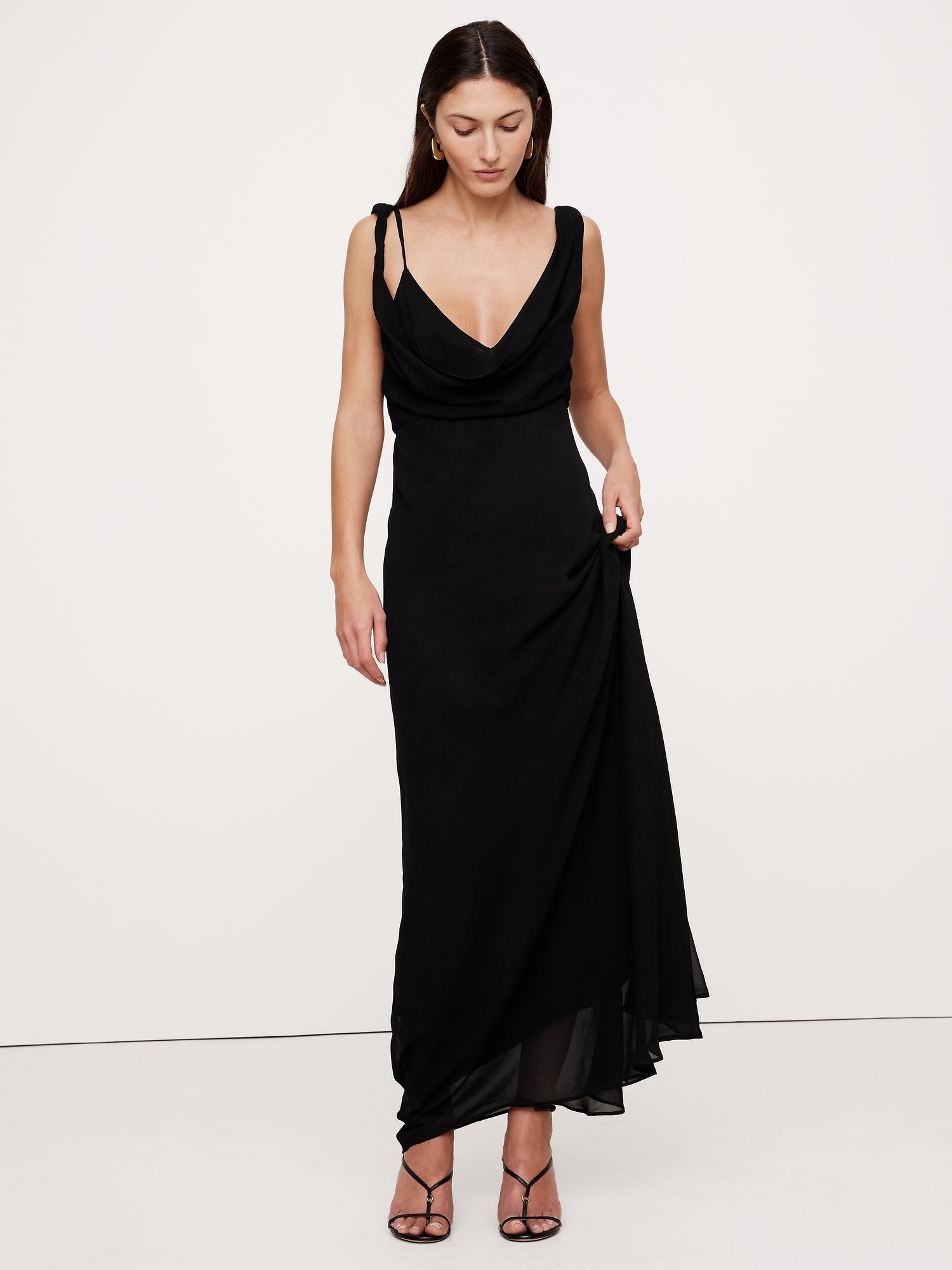 هيا، تفضلي، تفضلي. هذا الفستان، لمسة جديدة على فساتين الموسم بتصميم فضفاض، مصنوع من كريب فيسكوز خفيف كالشيفون مع مرونة خفيفة. تفاصيل الكتف الملتوية والأجزاء بقصّة مائلة تُبرز قوامه.