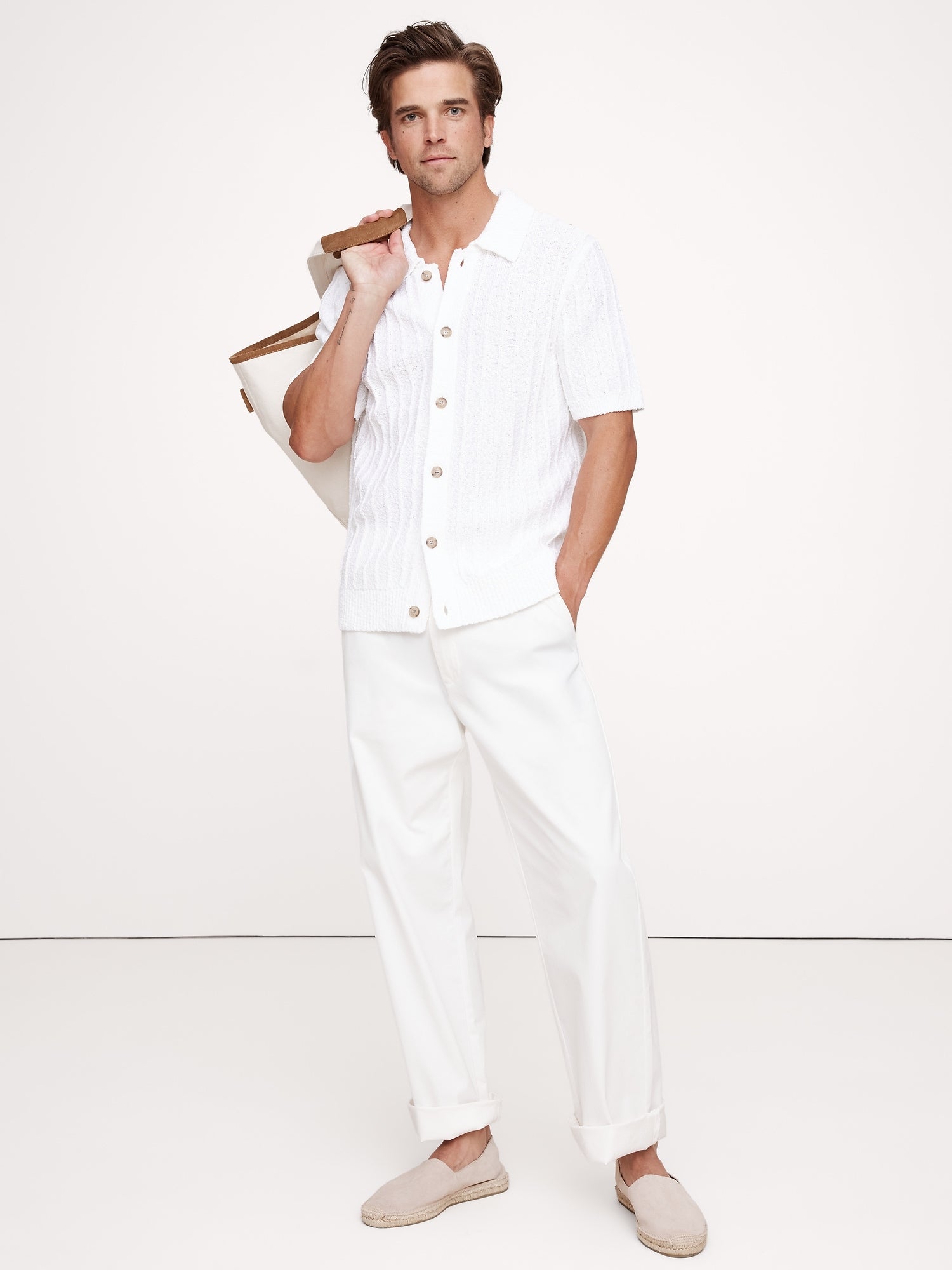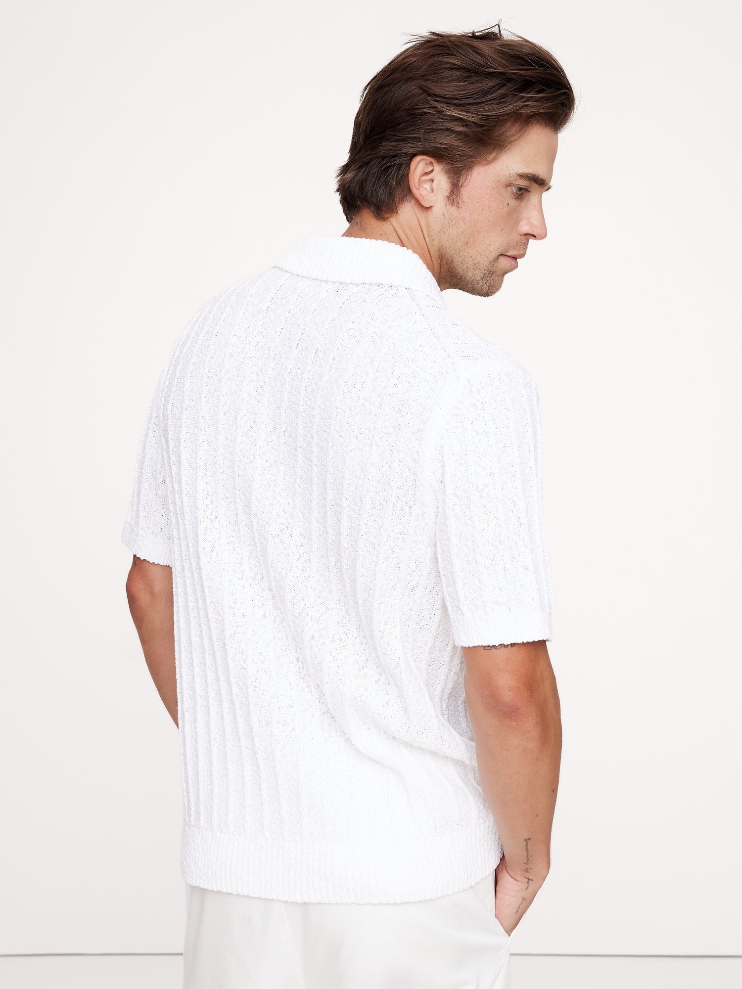 استعرنا نسيجًا مضلعًا واسع النطاق من قميص بولو عتيق، وأعدنا إنتاجه هنا بخيوط قطنية ناعمة لمزيد من الملمس.