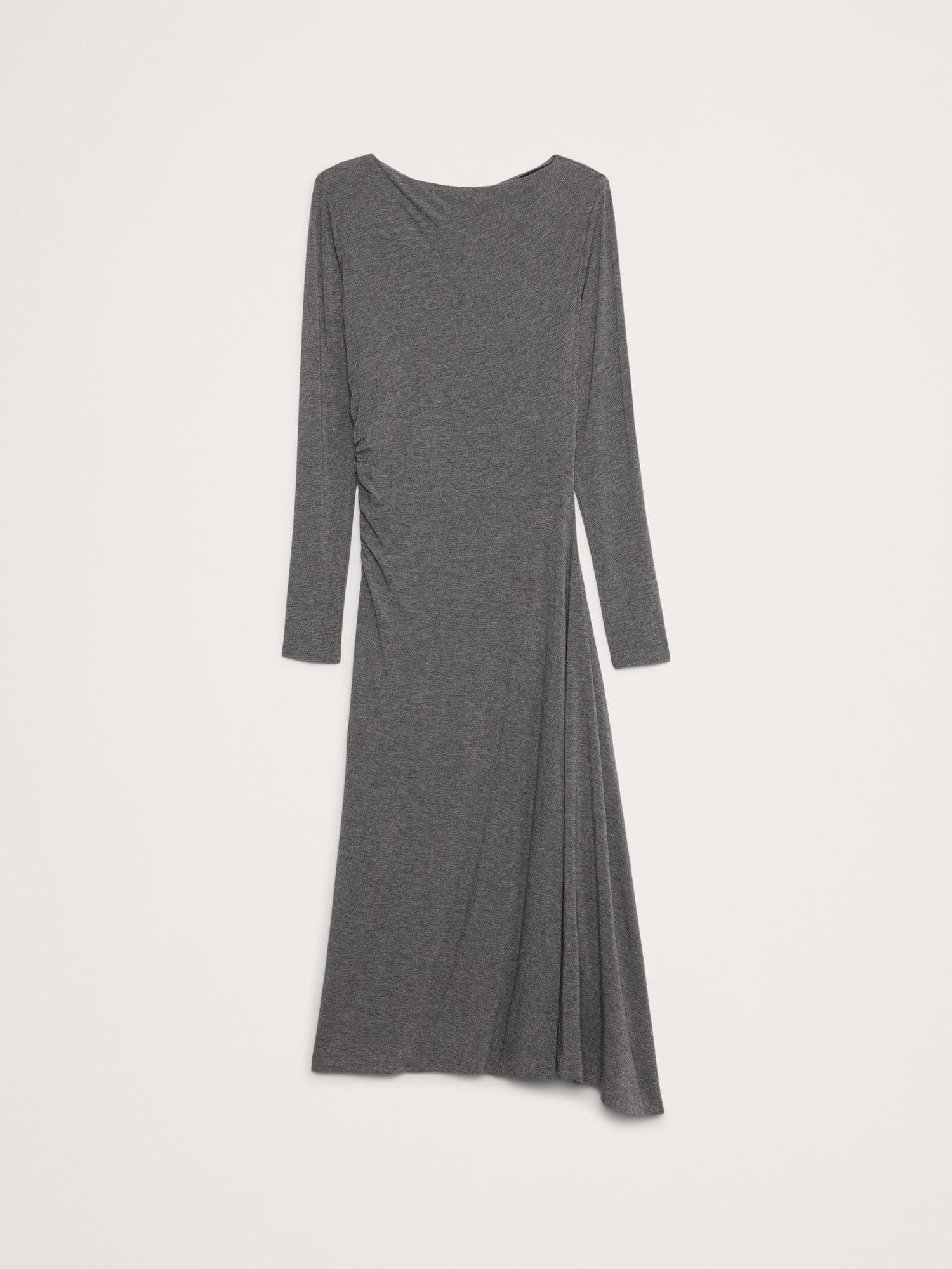 هذا الفستان متوسط الطول غير المتماثل مصنوع من قماش الجيرسي الصوفي المميز لدينا، والذي تم اختياره لخفته ودفئه وملمسه الناعم. هنا، نستخدم طولًا إضافيًا في الأكمام لإضفاء تأثير مجعد وتصميمًا مقسمًا لزيادة انحناء التنورة وتحقيق حاشية على شكل منديل.