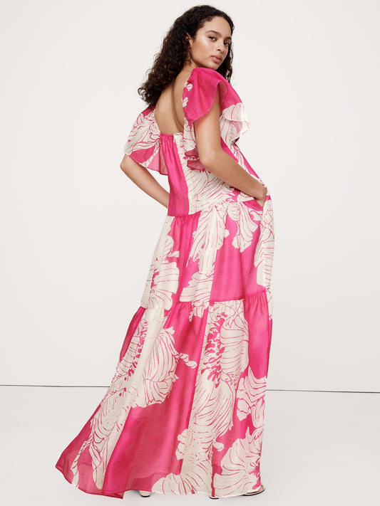STRETCH-CREPE FLUTTER-SLEEVE MAXI DRESS
