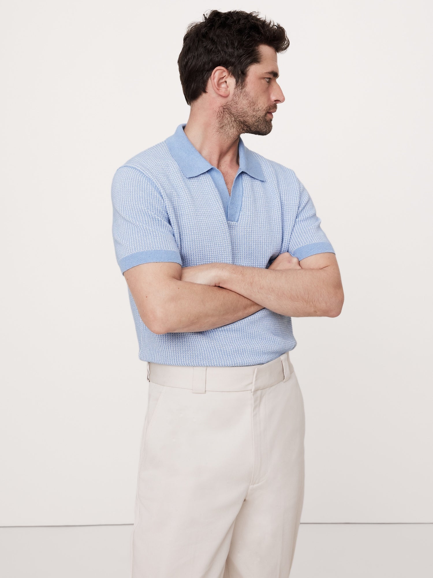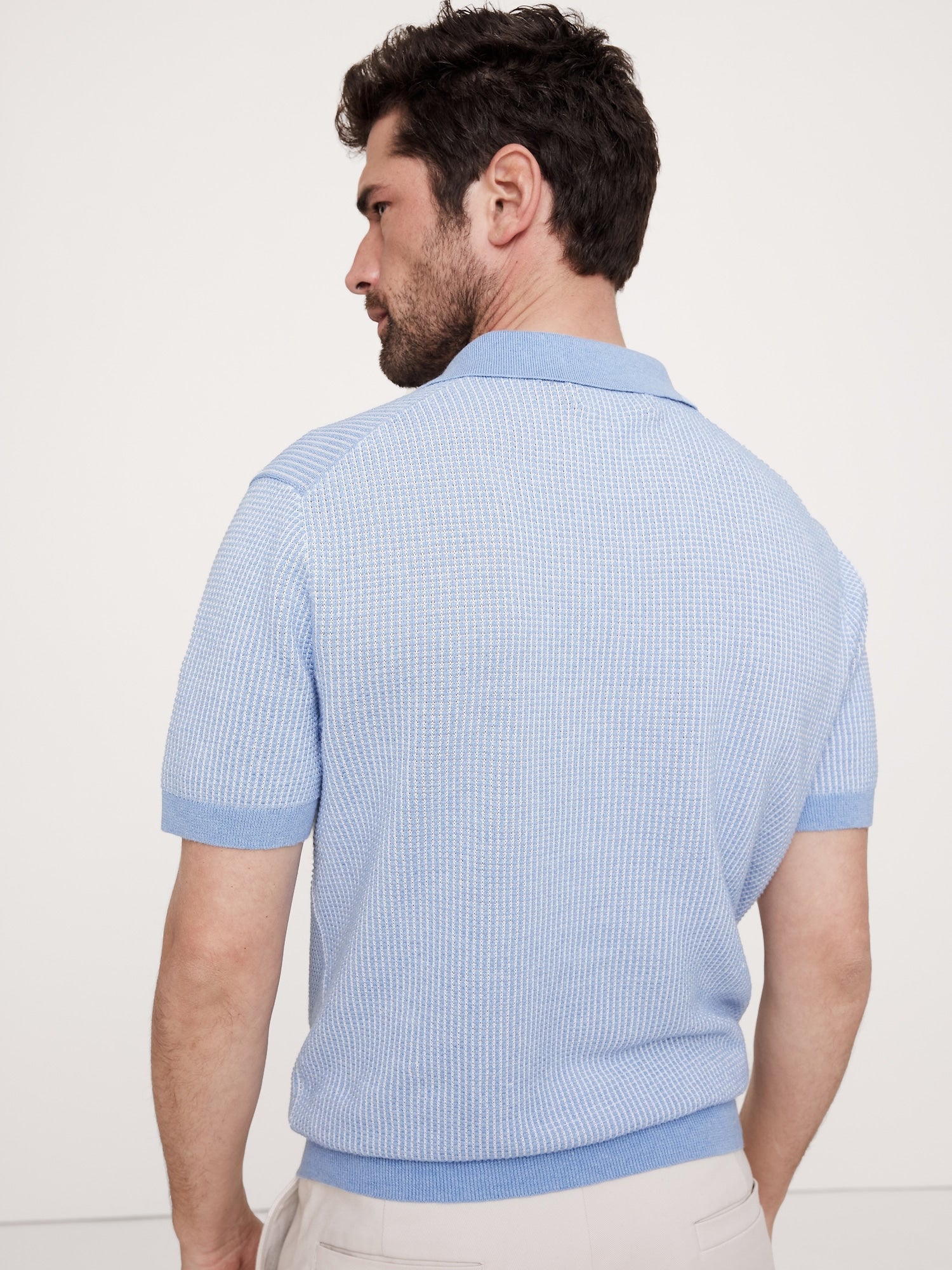 We love a retro sweater polo so we dreamed this one up in warm-weather ready cotton and linen. Look closely: it uses an intricate two-color jacquard stitch.