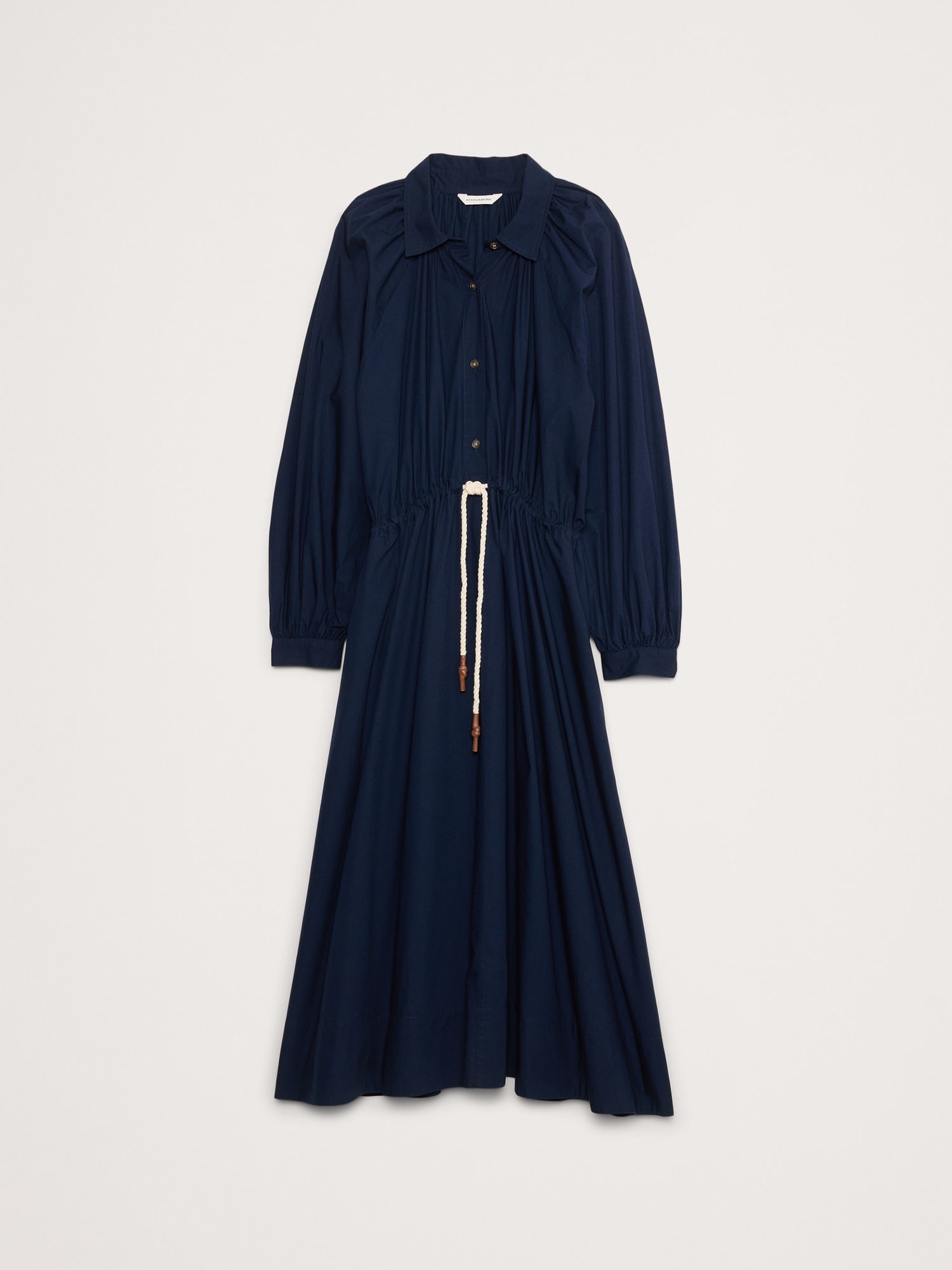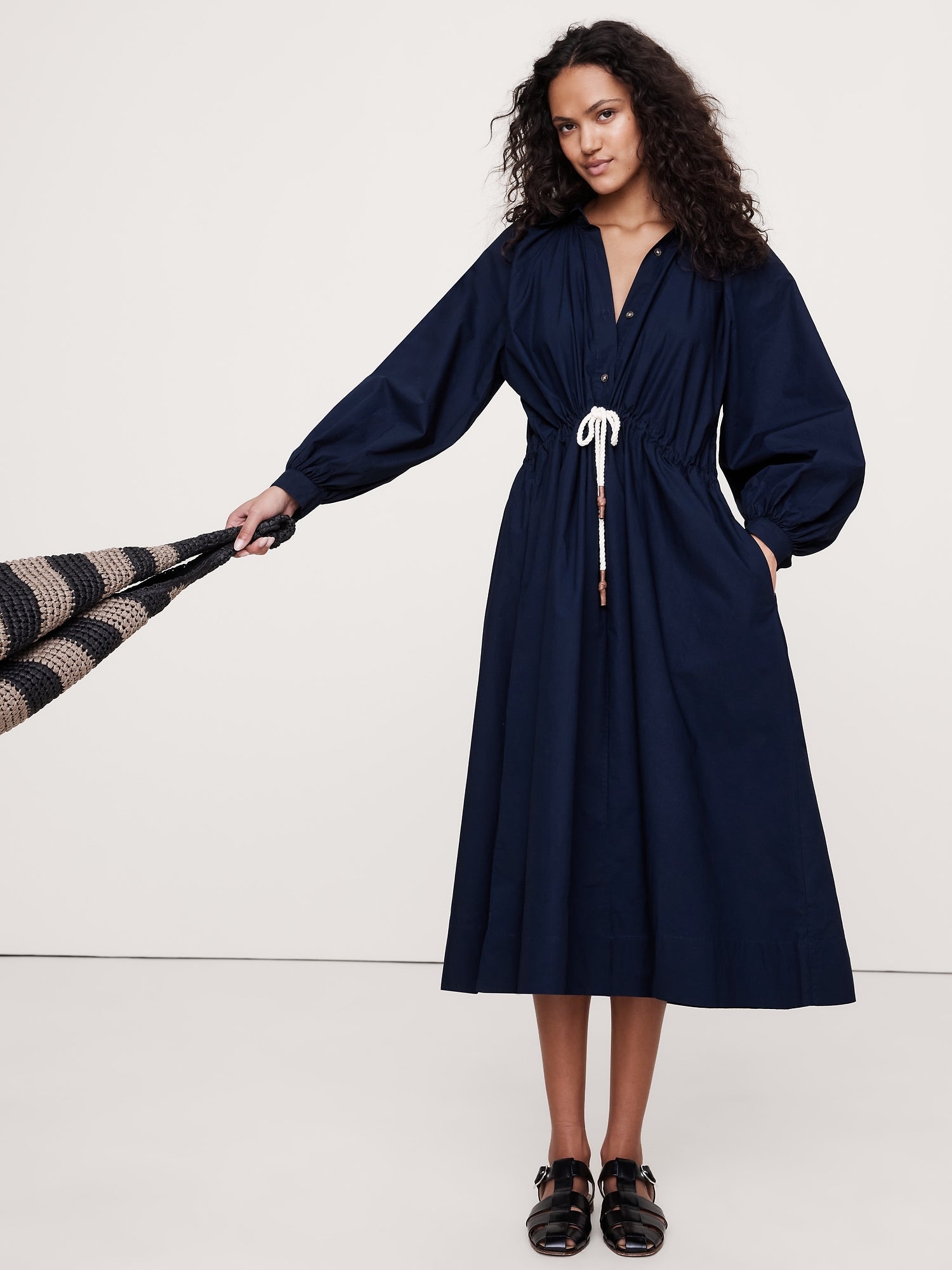 We're loving cotton poplin right now (and always). This dress nods at the season's volume-sleeve trend, fitted with shirtdress styling and a utilitarian drawstring at the waist.