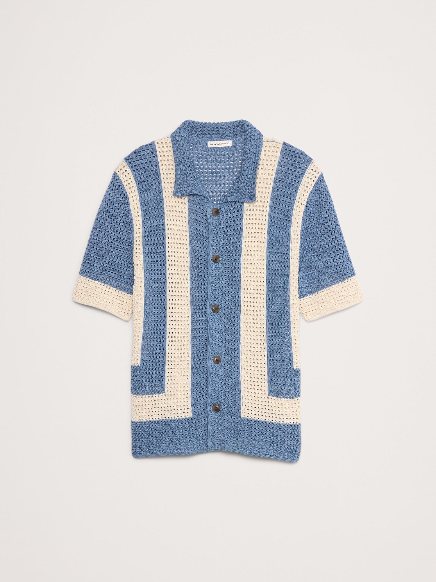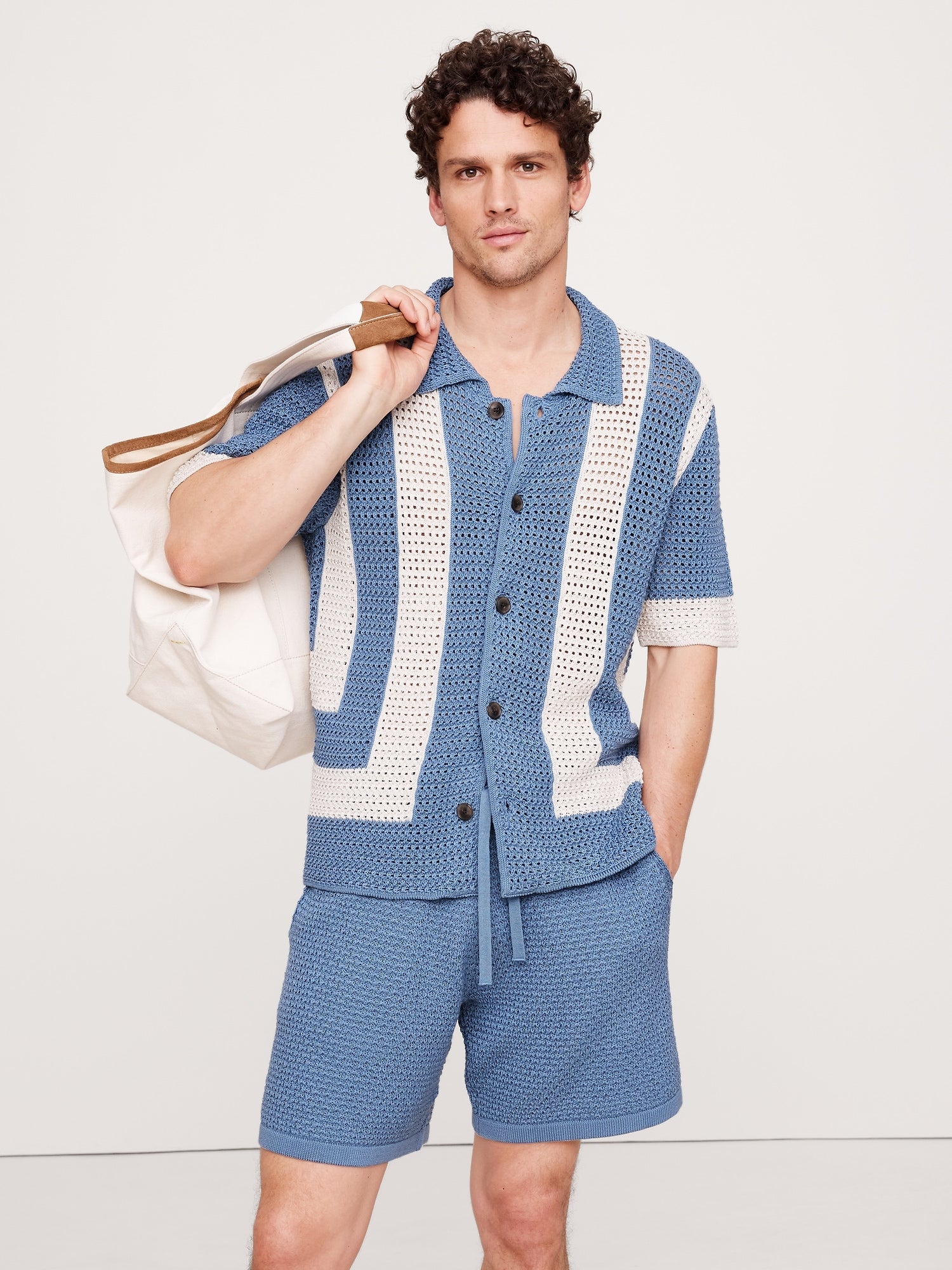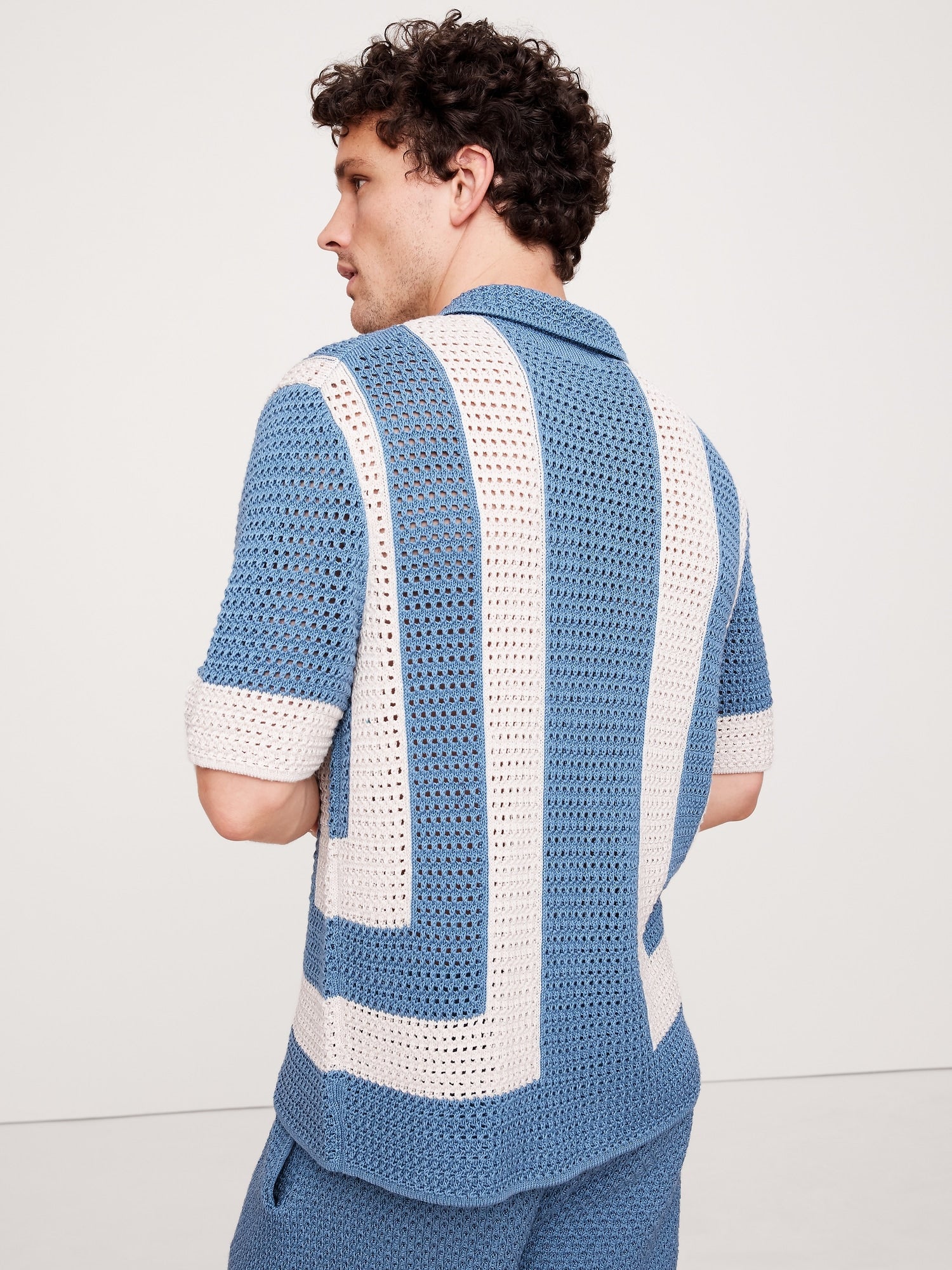 We wanted this resort shirt to capture the feel of the best handmade pieces so we chose a stitch pattern that mimics the look of true crochet, in 100% certified-organic cotton. Pair with the matching shorts to make it a set.