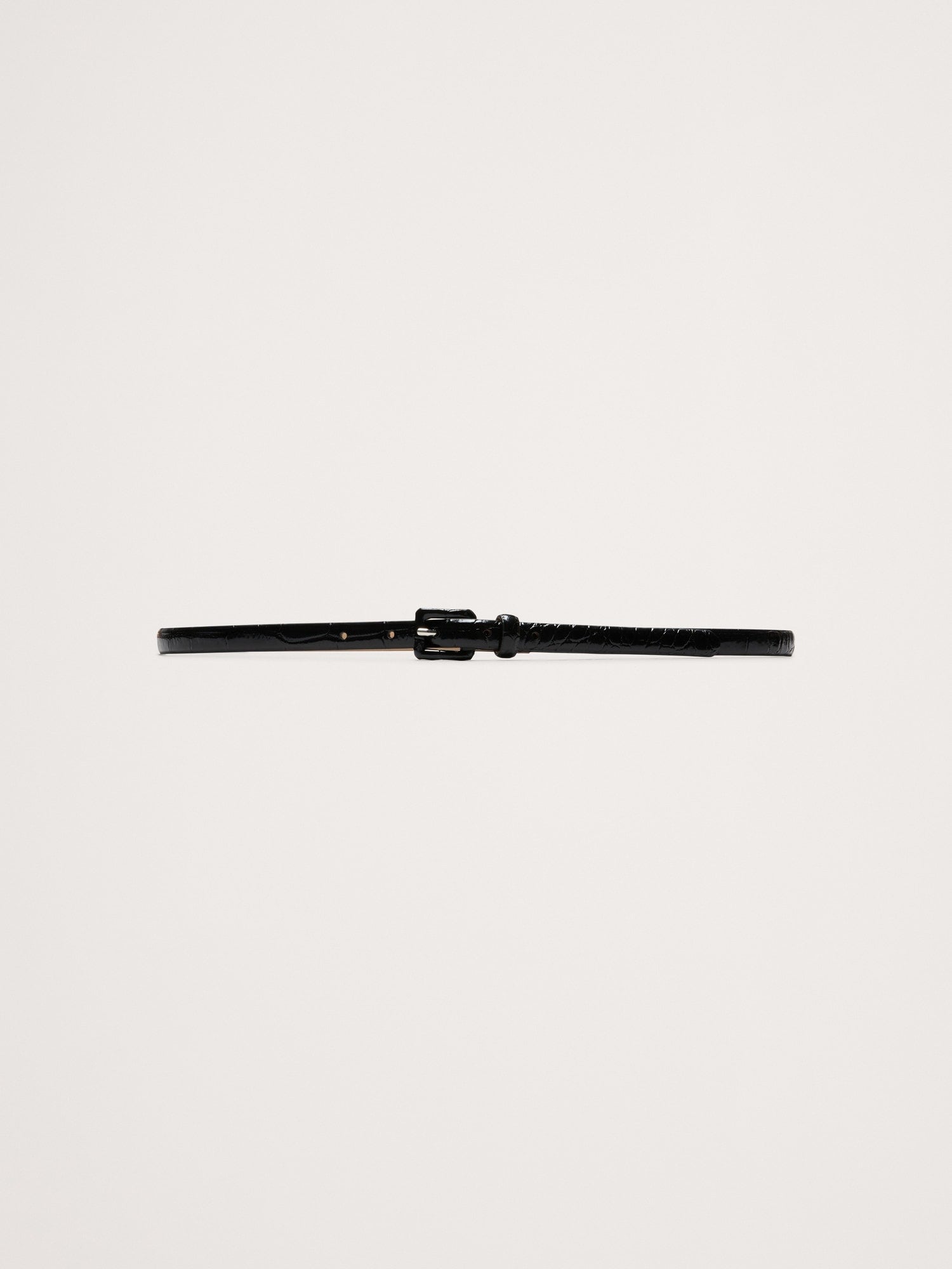 This skinny belt is designed to be worn at the hips and is made from leather embossed to mimic crocodile.