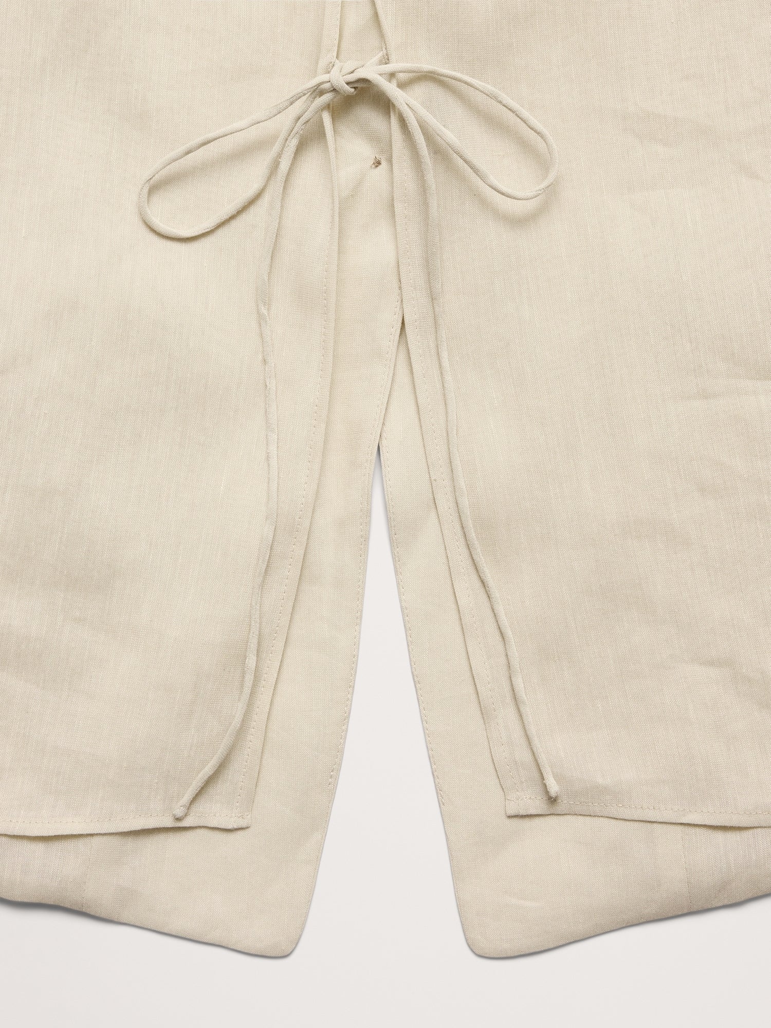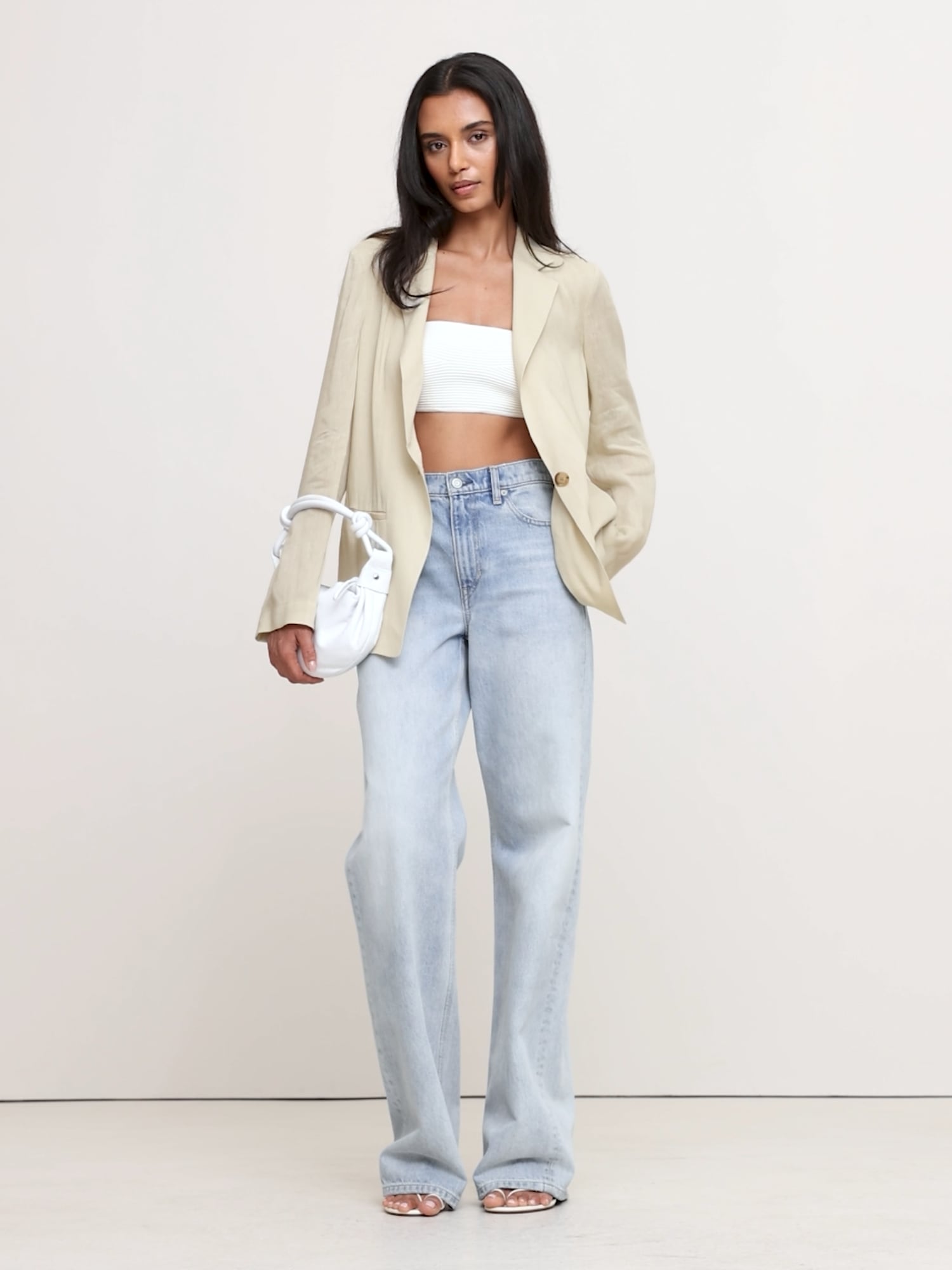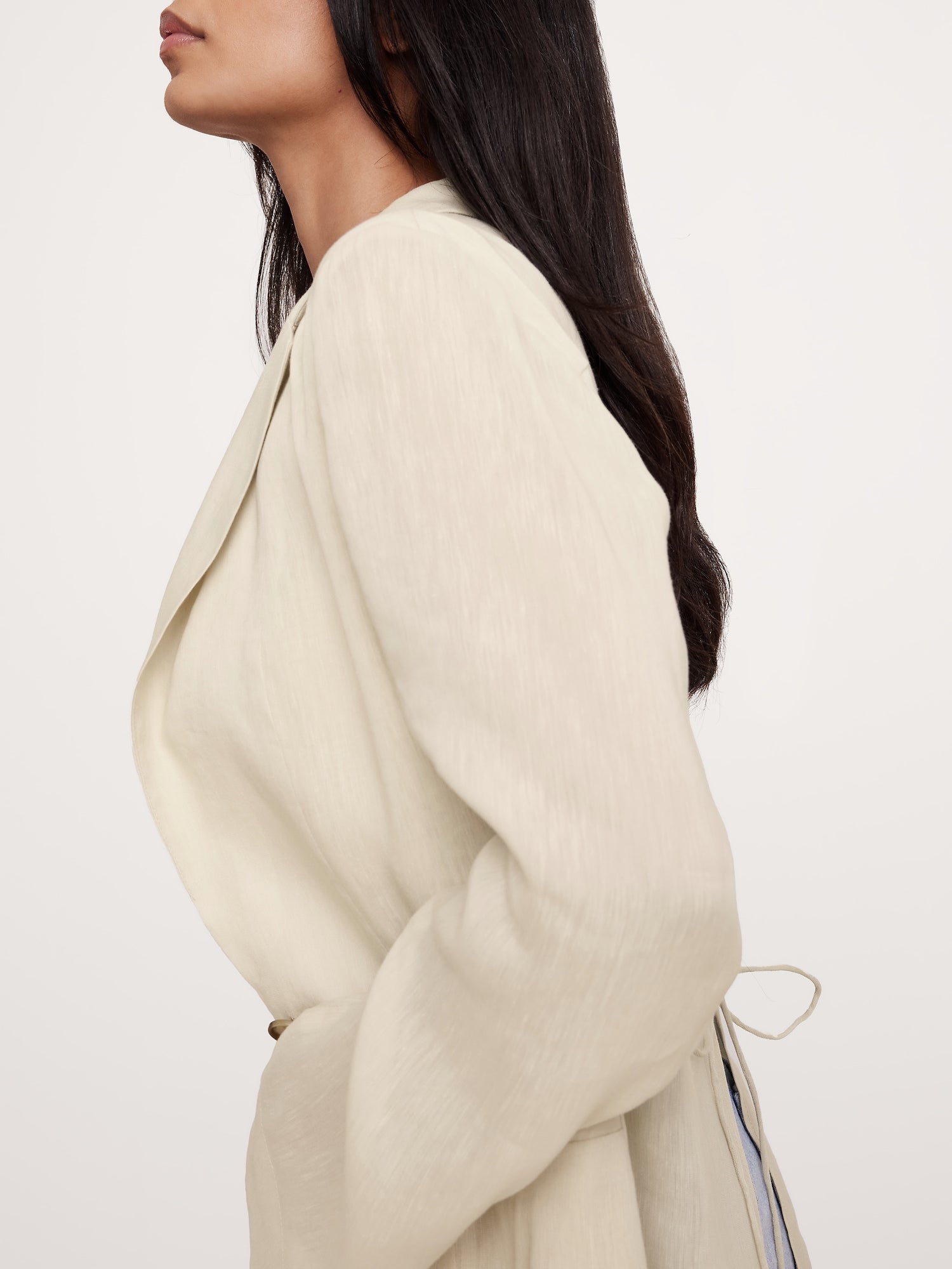 Designed with warm weather in mind, we kept the back and sleeves of this blazer unlined for better breathability. Plus we added a split-back detail with a tie at back, cut in a light linen and viscose blend.