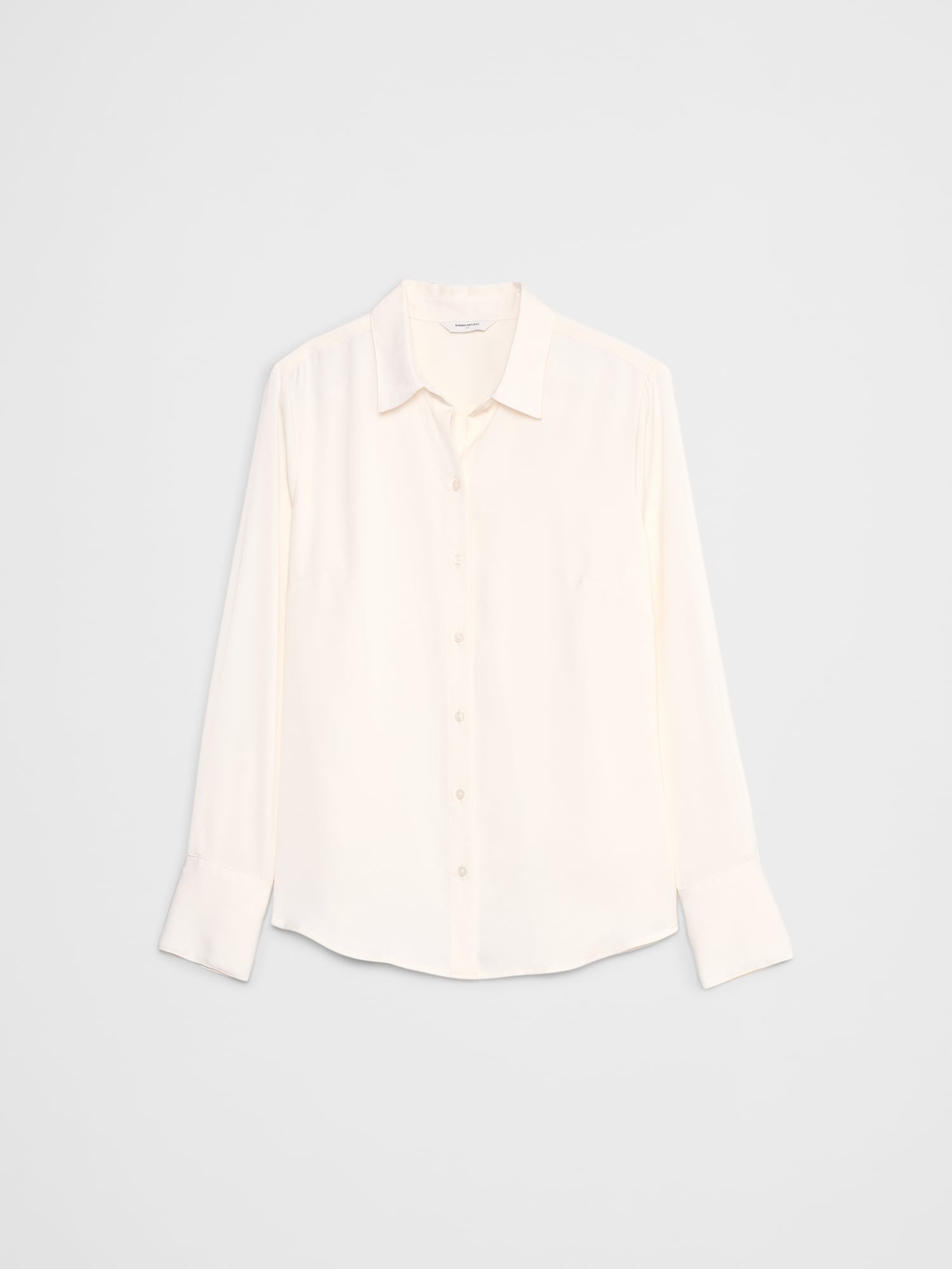 Relaunch to our classic silky shirt in new recycled polyester fabric, silky crepe. More of a cleaner matte finish making this piece more elevated and modern.