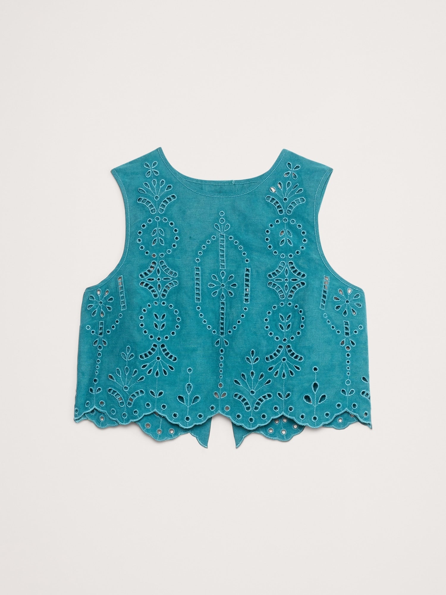 Prepare for compliments. We cut this open-back top in an heirloom-level eyelet fabric that blends silky TENCEL™ and breathable linen. Make it a set with the matching skirt.